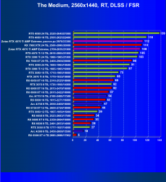 Рейтинг составлен по 9 тестам, в которых используется технология трассировки лучей и одновременно технология Nvidia DLSS или AMD FSR. Этот рейтинг нормирован по самому слабому ускорителю в данной группе — Radeon RX 6500 XT (то есть сочетание скорости и функций Radeon RX 6500 XT приняты за 100%).