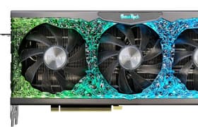 Palit GeForce RTX 3070 Ti GameRock OC (8 ГБ) — как обычно, очень красивый представитель предфлагманского ускорителя GeForce RTX 3070 Ti. Данная модель имеет неплохой разгонный потенциал. Кулер шумный, хотя и достаточно эффективный. Карта предлагает два режима работы СО (BIOS 1/2), и во втором случае кулер работает немного тише. Стоит отметить возможность синхронизации подсветки с материнскими платами. Карта займет в корпусе 3 слота, но ее длина не чрезмерна — всего 300 мм.