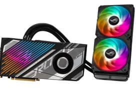 Asus ROG Strix LC GeForce RTX 3080 Ti OC Edition (12 ГБ) — очень мощный флагманский игровой ускоритель, догоняющий даже более дорогой GeForce RTX 3090 по производительности в играх и обладающий приличным разгонным потенциалом. Повышенные Boost-частоты обеспечивают неплохую прибавку скорости в разрешении 4К, на сегодня это самый быстрый GeForce RTX 3080 Ti на рынке. Карта использует систему жидкостного охлаждения, что требует использования корпуса ПК, в который можно установить радиатор СЖО. Система охлаждения, как и у других подобных устройств, работает шумно, однако многое зависит от расположения радиатора СЖО в корпусе. Карта может потреблять до 400-410 Вт, у нее три 8-контактных разъема питания, наличие очень мощного БП обязательно! Также карта отличается очень красивой подсветкой.