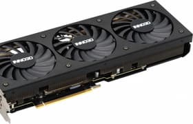 Inno3D GeForce RTX 3080 Ti X3 OC (12 ГБ) — достаточно простая реализация флагманского игрового ускорителя, для тех геймеров, кого не интересует внешность компьютерных компонентов. Систему охлаждения нельзя назвать тихой, но для двухслотового решения шум очень низкий — вспомним, как шумела референс-карта Nvidia. Оборотной стороной является высокий нагрев компонентов, потому что карта Inno3D может потреблять до 350 Вт. Потребуется хорошо вентилируемый корпус, потому что весь нагретый воздух видеокарта оставляет внутри системного блока.