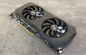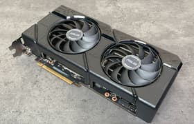 Asus Dual Radeon RX 7800 XT OC (16 ГБ) — видеокарта из средней ценовой категории, она может быть интересна тем, кто предпочитает играть без использования технологий трассировки лучей и динамического масштабирования, а также не интересуется внешним видом карты. В таком случае это лучший выбор на сегодня по совокупности факторов. Карта Asus способна потреблять до 266 Вт и имеет два 8-контактных разъема питания версии PCIe 2.0. Система охлаждения достаточно эффективная и весьма тихая в режиме BIOS Q-Mode. Габариты этой модели составляют 28 см в длину и 13,5 см в высоту, а по толщине видеокарта занимает 3 слота в корпусе. Набор видеовыходов стандартный: 3 DP 2.1 и 1 HDMI 2.1.