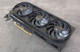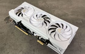 Asus TUF Gaming GeForce RTX 4070 Ti Super BTF White OC (16 ГБ) — уникальная в своем роде видеокарта, попытка отказаться от стандарта, а то и навязать свой стандарт индустрии. Она не имеет привычных разъемов питания и может получать питание исключительно от материнской платы Asus той же линейки BTF, поэтому их стоит приобретать в паре (и вместе с совместимым корпусом). Карта способна потреблять до 271 Вт (разовые всплески могут быть выше). Система охлаждения очень мощная, эффективная и тихая, а при переключении в специальный режим — даже очень тихая. Видеокарта очень крупная, ее длина составляет почти 31 см, а по толщине она занимает 4 слота в корпусе. Набор видеовыходов — 3 DP и 2 HDMI (одновременно работают 4 любых).