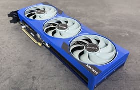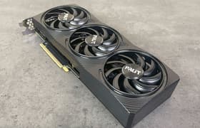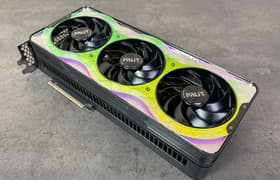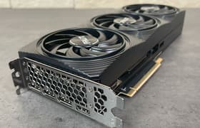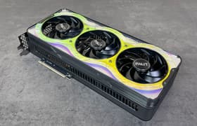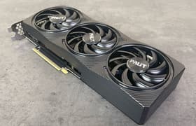 Palit GeForce RTX 5080 GamingPro OC (16 ГБ) — самый бюджетный вариант (как бы смешно это ни звучало) флагманского ускорителя последнего поколения, второго после GeForce RTX 5090 в нынешней табели о рангах у Nvidia. Карта Palit способна потреблять до 361 Вт. Система охлаждения весьма мощная и не слишком шумная (но есть звенящий призвук при работе вентиляторов). Из-за возможности поднять лимит потребления ручной разгон может обеспечить прирост скорости до 5,5% (в разрешении 4K), однако карта и по умолчанию имеет фабрично повышенные частоты работы, демонстрируя на 2,5%-3% более высокую производительность, чем референсная. Габариты этой модели составляют 33 см в длину и 13 см в высоту, а по толщине видеокарта занимает 3 слота в корпусе. Набор видеовыходов стандартный: 3 DP 2.1b и 1 HDMI 2.1b.