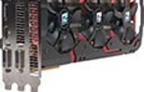 PowerColor Devil13 (2×Radeon R9 290X) 2×4096 МБ 2×512-битной GDDR5 PCI-E — на сегодня реально самый производительный ускоритель игрового класса (правда, с оговоркой: мы еще не тестировали NVIDIA GeForce Titan-Z, и после его тестирования расклад победителей может измениться). Devil13 обладает завидным оверклокерским потенциалом благодаря модернизированному силовому блоку: ядра смогли работать на частоте в 1200(!) МГц, а память — на частоте 6200 МГц. При этом работа карты была стабильной, а по производительности все конкуренты остались далеко позади. В то же время следует помнить, что PowerColor Devil13 очень шумная, и отчасти утихомирить ее может только Quiet-режим работы ускорителя. Разгона при этом не будет (он не имеет смысла, ибо повышение частоты работы ядер тут же увеличит шум работы СО), производительность упадет на считанные проценты, но зато ускоритель если и будет шуметь, то уже незначительно. Мы полагаем, что и в Uber-режиме можно было бы снизить шум, правильно отрегулировав и скоординировав работу трех вентиляторов. В остальном Devil13 — продукт премиум-класса, имеющий отличный комплект (добротная геймерская мышь и подставка под карту). Цены... цены... ну, и по такой цене Devil13 приобретут хотя бы с десяток энтузиастов. А большего и не требуется: это не массовый, а статусный, имиджевый продукт.