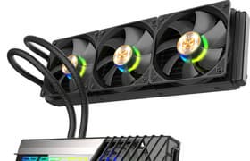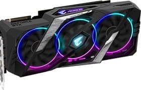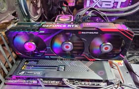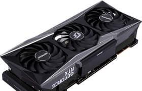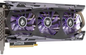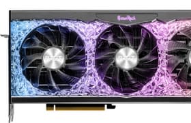 Colorful iGame GeForce RTX 3080 Ti Vulcan OC-V (12 ГБ) — ускоритель с очень тяжелой и громоздкой трехслотовой системой охлаждения, его вес превышает 2 кг, поэтому в комплекте идет подставка. У карты отличный потенциал разгона, с ним этот ускоритель сможет почти догнать более дорогой GeForce RTX 3090. Карта оснащена памятью GDDR6X (Micron) объемом 12 ГБ. Главной особенностью карты является наличие миниатюрного ЖК-экрана, на который можно выводить показатели мониторинга или произвольную анимацию из пользовательского файла. Система охлаждения достаточно шумная, но карта и потребляет под разгоном до 390 Вт. Снова повторим, что GeForce RTX 3080 Ti годится для игр в разрешении 4К с максимальным качеством графики с трассировкой лучей даже без DLSS.