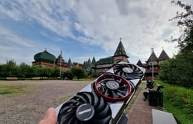 Colorful iGame GeForce RTX 3090 Ti Vulcan OC-V (24 ГБ) — очень симпатичное и исключительно мощное решение. Карта является весьма длинной и очень широкой, занимает 4 слота в корпусе. В комплекте поставки есть поддерживающий штатив с опорой на дно корпуса, поэтому за прогибание карты в системном блоке можно не волноваться. Шум от системы охлаждения заметный, но терпимый. Карта может потреблять почти 500 Вт, она требует три 8-контактных разъема питания, так что наличие мощного БП обязательно! Заодно требуется хорошо продуваемый корпус, поскольку почти весь нагретый воздух остается внутри системного блока. Видеокарта имеет два режима работы: с повышенными частотами (One-key OC), и с частотами на уровне референсных.