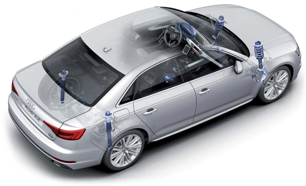 В Audi A4 поколения B9 конструкторы применили пятирычажную подвеску, которая по конструкции и принципам действия идентична подвеске вседорожника Audi Q7. Рычаги передней и часть рычагов задней подвески выполнены из алюминиевого сплава. Допускается ремонтная замена одного из четырех шаровых шарниров и всех сайлентблоков рычагов передней подвески. Единственным вариантом ремонта рычагов задней подвески является их замена.