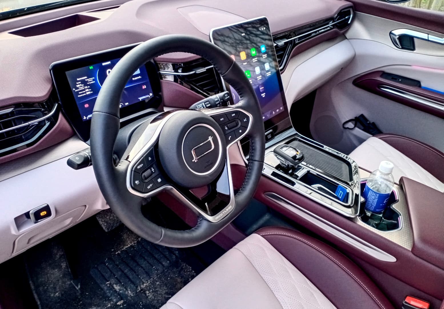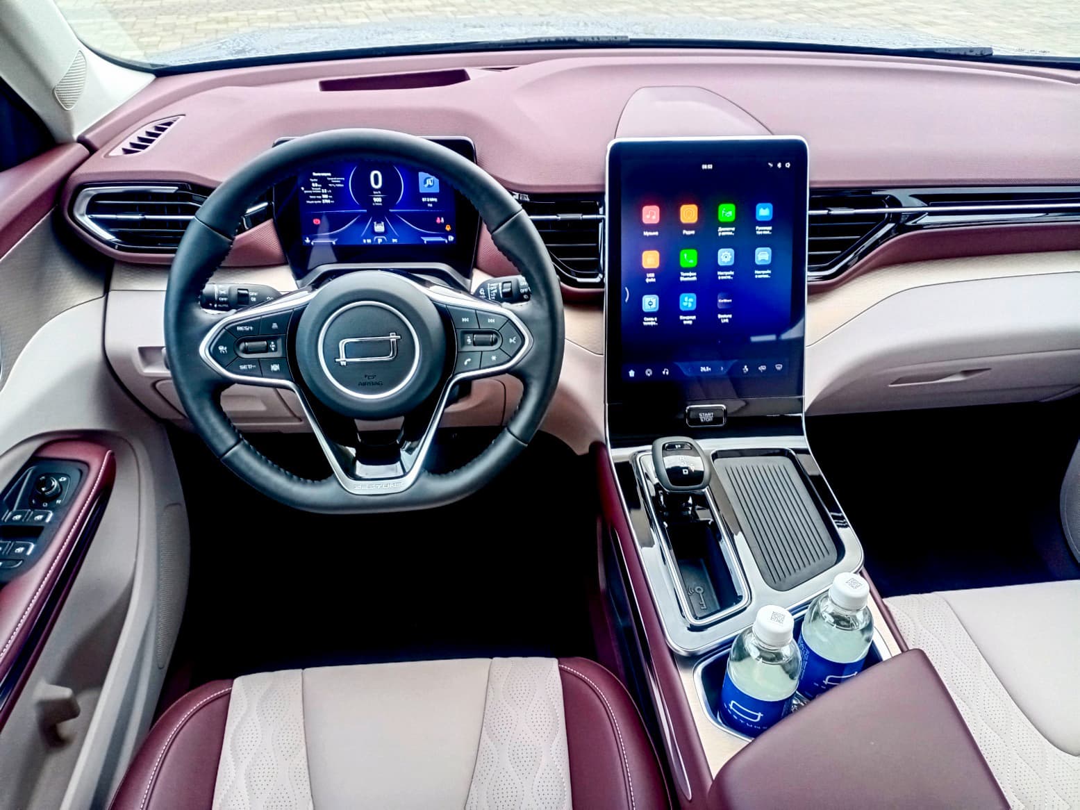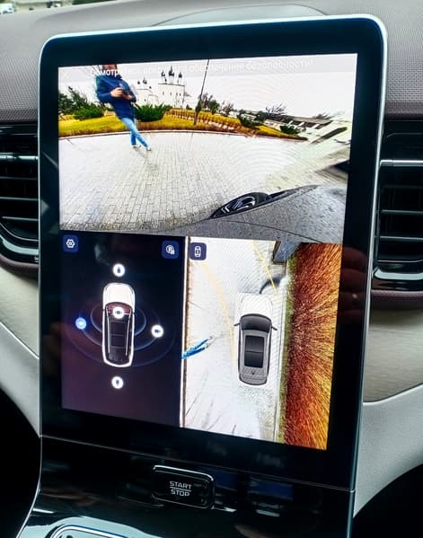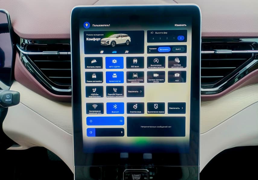 Русификация мультимедийного комплекса выполнена получше в сравнении с Bestune B70, где, как вы помните, не обошлось без ляпов. 12,6-дюймовый дисплей вертикально-наклонного типа «вырастает» практически из центрального тоннеля (там, где кнопка запуска двигателя). В нем много глянца, поэтому он быстро пачкается и сильно бликует. При этом экран довольно отзывчивый и оперативно реагирующий на команды. Глубоко искать необходимую информацию не приходится, функции «зашиты» в интуитивно понятные места. «Опускаем», например, шторку и быстро выбираем необходимый режим работы двигателя (Eco, Normal, Sport). Посредством верхней шторки удобно активировать и, наоборот, отключать систему стабилизации, камеры кругового обзора, функцию Auto Hold и т. п. Нижняя панель меню, как водится, отдана под самые востребованные операции (музыка, климат, подогревы). При желании можно использовать программируемую кнопку рулевого колеса для активации его подогрева.