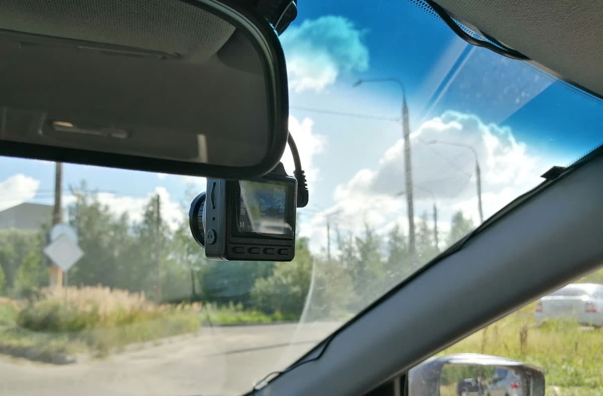 Крепить регистратор на лобовое стекло рекомендуется в районе зеркала заднего вида. В нашем случае оптимальным местом для установки оказался верхний край лобового стекла справа от зеркала заднего вида, поскольку место на стекле непосредственно за зеркалом уже занято, там находится стационарный, установленный еще в автосервисе, двухкамерный регистратор.