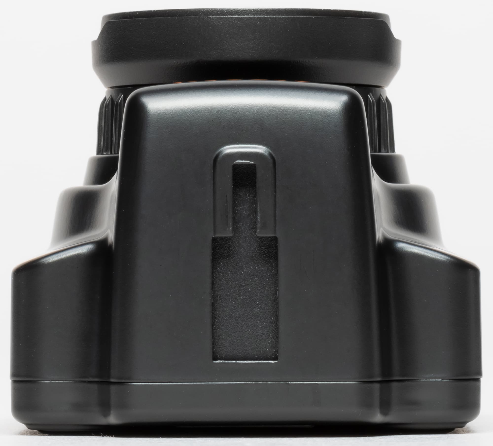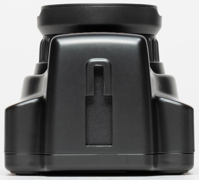 Своим дизайном прибор напоминает зеркальный фотоаппарат, не забыт и модуль «вспышки», находящийся над объективом. О миниатюрности устройства можно судить, сопоставив размер слота карты памяти microSD с габаритами аппарата: регистратор легко умещается в кулаке.