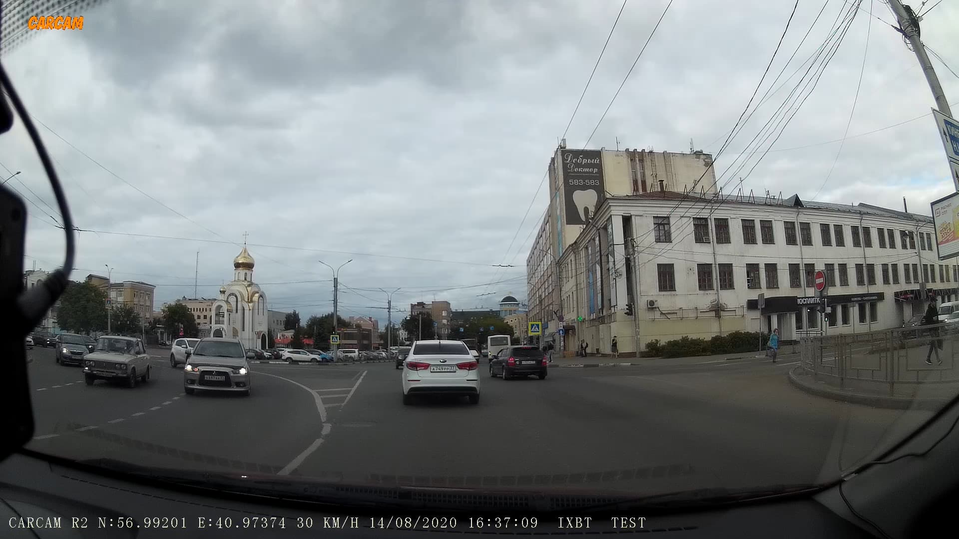 Следующий стоп-кадр взят из видео, записанного пасмурным днем при движении с небольшой скоростью. Можно видеть, что камера регистратора даже при таком скудном освещении неплохо фиксирует мелкие детали (госномер встречного автомобиля) с расстояния 10 метров. Пусть и с трудом, но эти номера вполне можно различить.