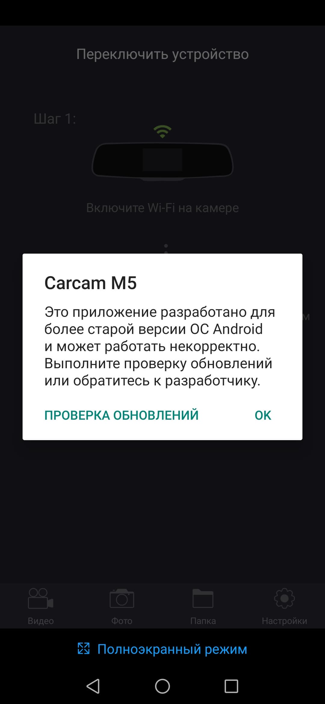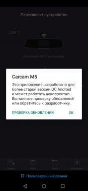 Мобильное приложение, посредством которого осуществляется работа с регистратором, называется Carcam M5 (версия для Android, версия для iOS). Эта простая, стабильная программа с интуитивно понятным, как теперь принято говорить, интерфейсом, работает исправно, быстро, без вылетов или зависаний. Даже несмотря на предупреждение о том, что текущая 10-я версия Android является слишком новой для приложения.