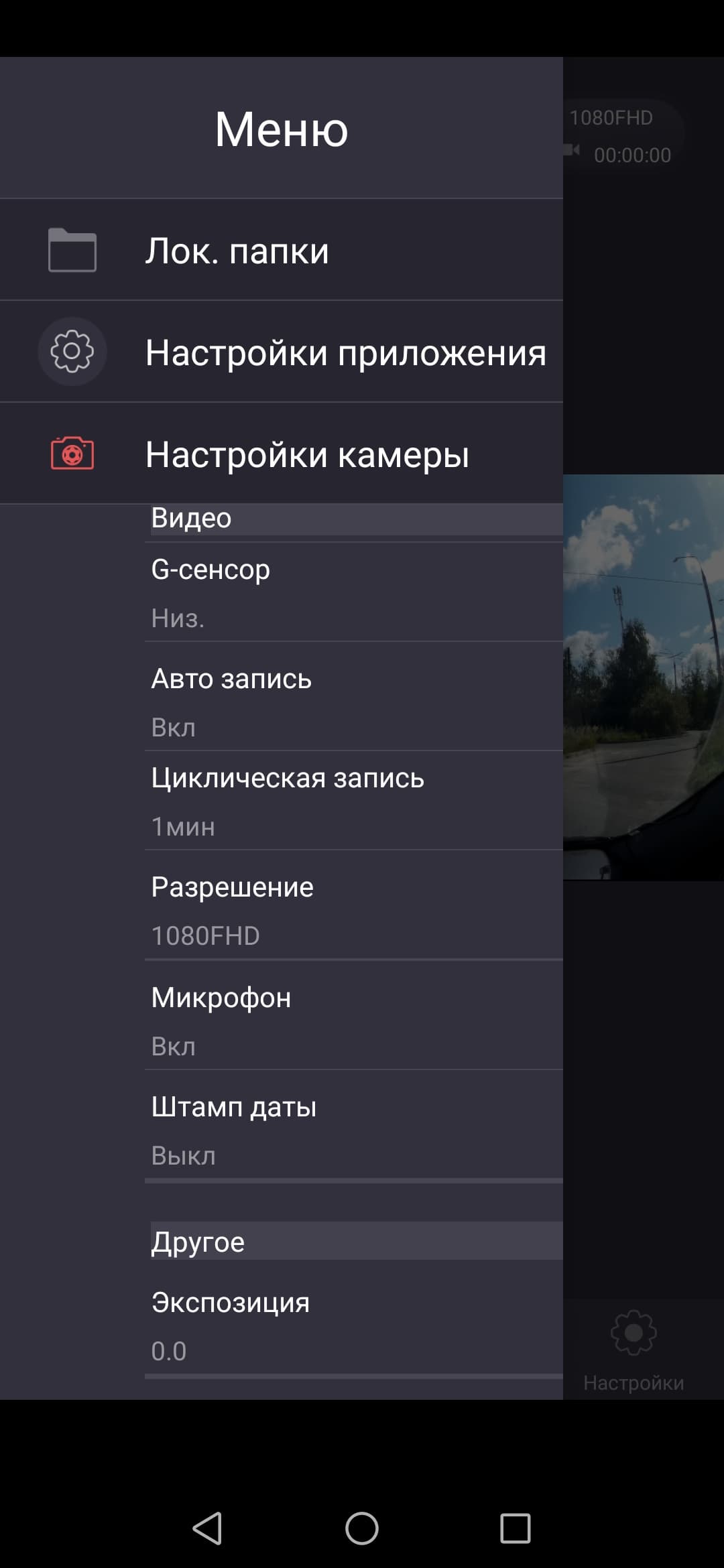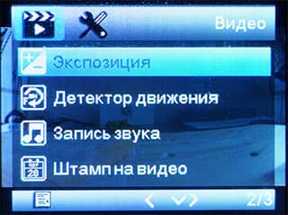 Видеонастройки позволяют изменить основные параметры регистратора: сдвиг экспозиции (по мнению автора, это совершенно ненужный параметр для автомобильных камер), включить детектор движения в режиме парковки, включить/отключить запись звука, активировать впечатывание в видеокадр текстовой информации (штамп), выбрать длительность роликов в циклической записи и т. д.