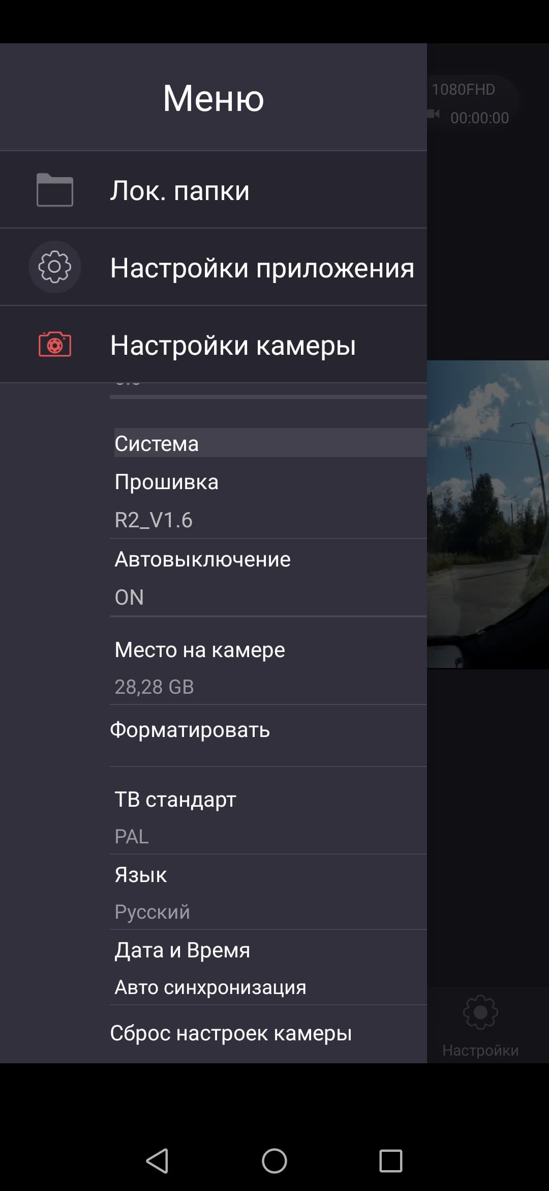 В системных настройках изменяется время выключения экрана, активируется режим парковки, определяется частота электросети региона, а также вводится пользовательский текст, который будет впечатываться в кадр вместе с другими данными.