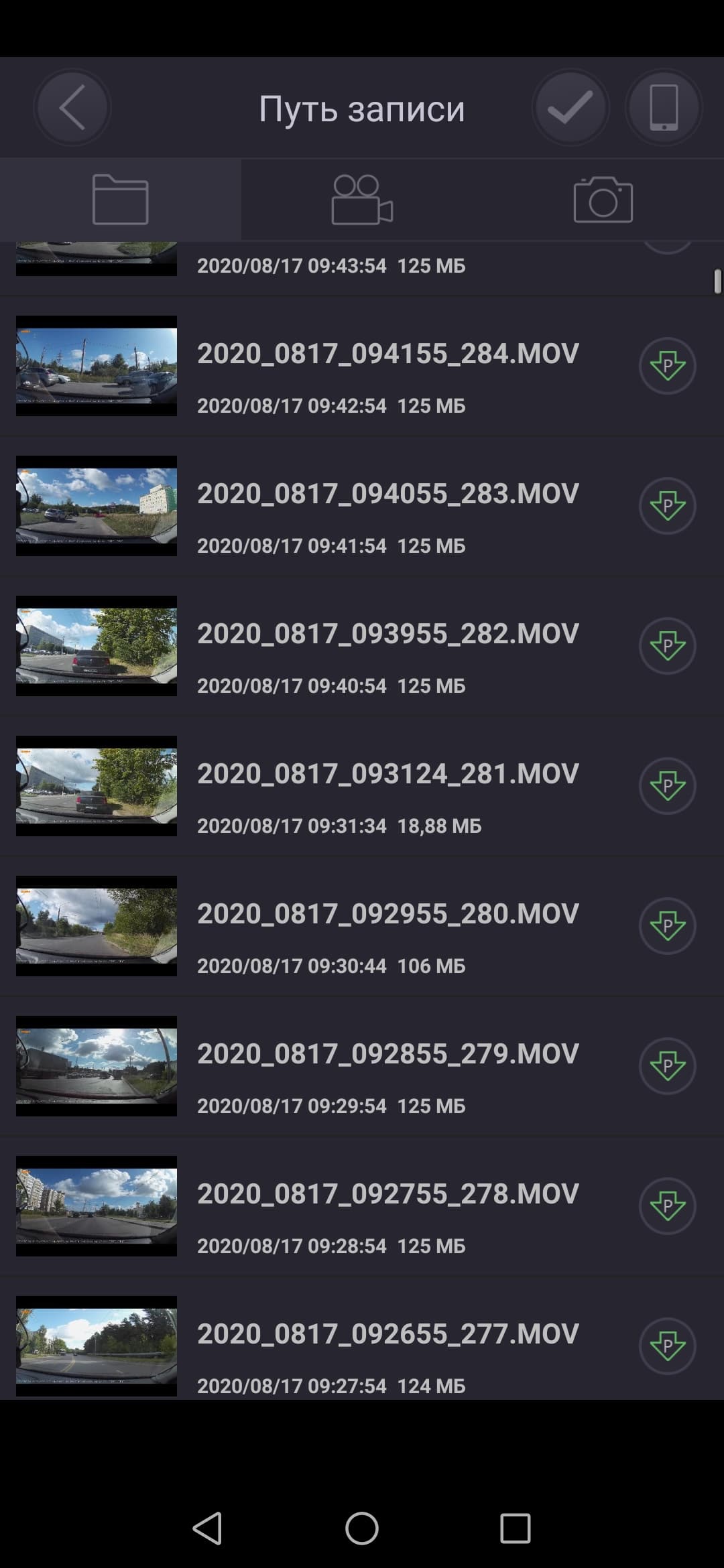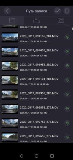 Но чем по-настоящему полезна функция беспроводной связи с регистратором — это оперативный просмотр записей на большом экране смартфона или планшета с возможностью копирования материала. Для этих целей в приложении имеется файловый браузер, в котором отображается весь контент, имеющийся на карте памяти.