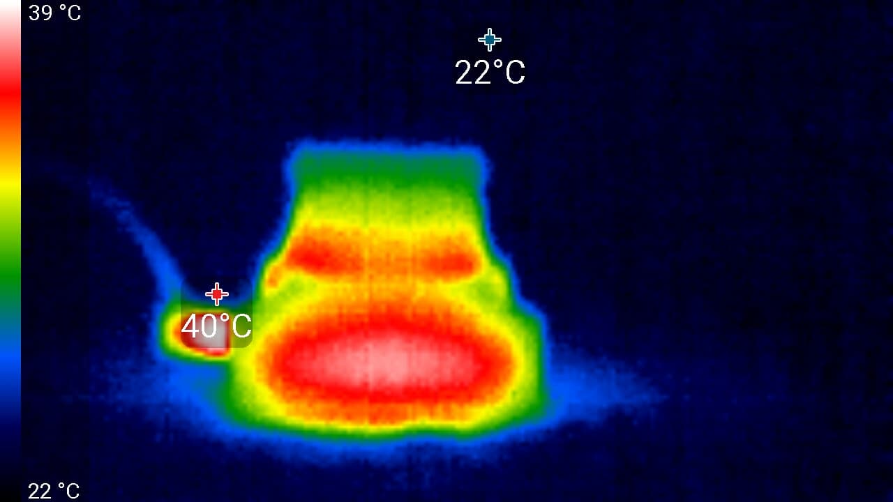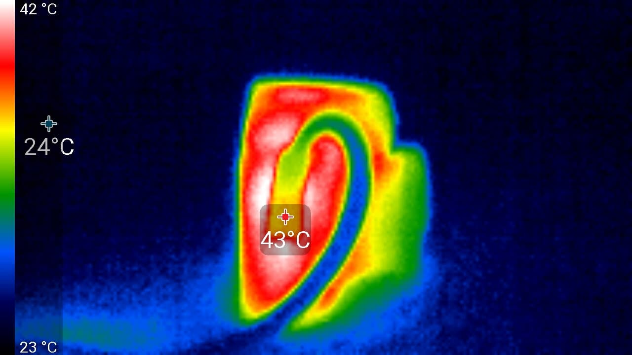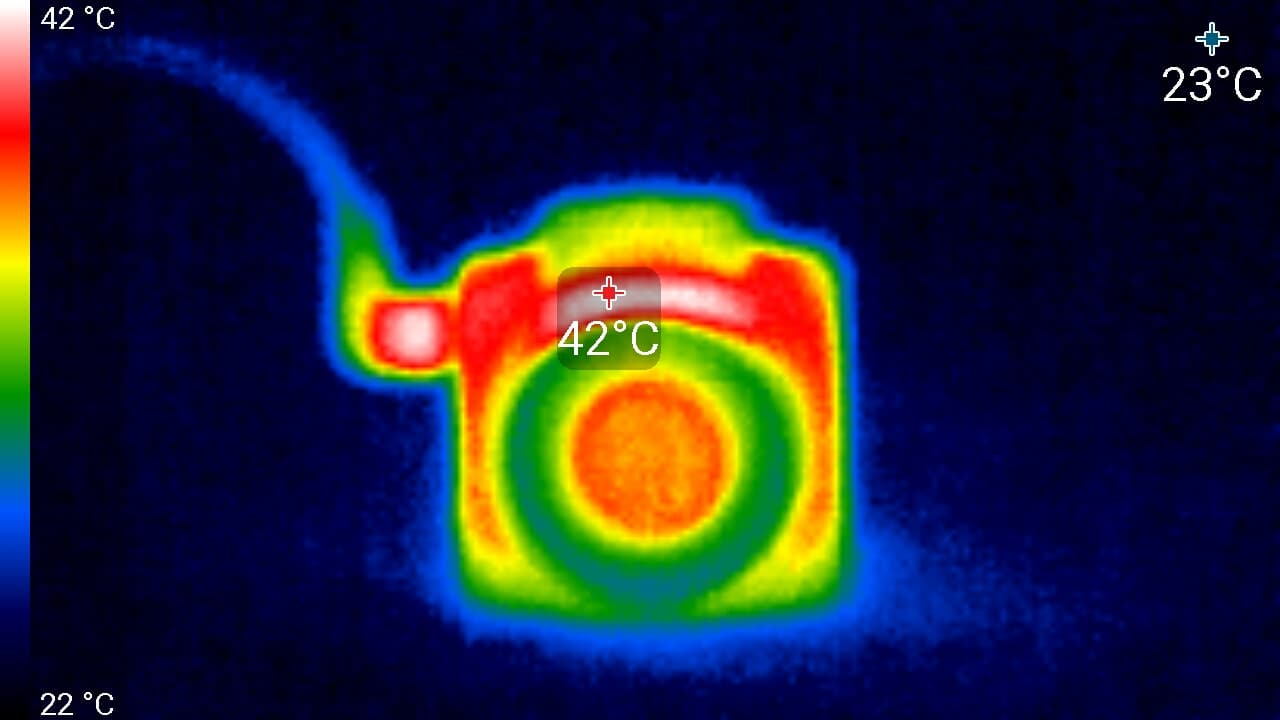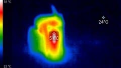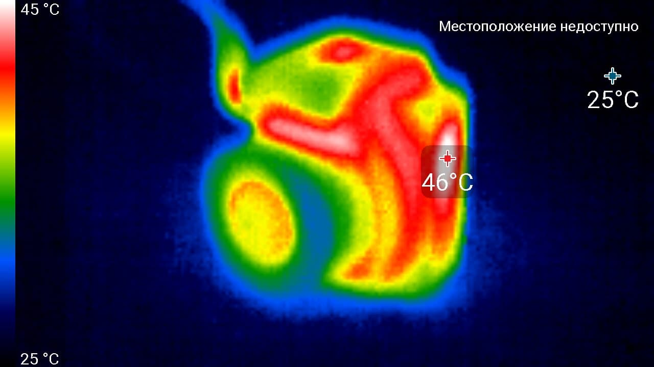 Во время длительной работы корпус аппарата нагревается незначительно, присутствуют лишь локальные участки с явным перегревом. Ниже приведены тепловизионные снимки прибора, сделанные после часа беспрерывной видеозаписи с работающим дисплеем. Питание регистратору подавалось стационарное, тестирование проводилось в комнатных условиях при температуре окружающего воздуха около 25 °C.