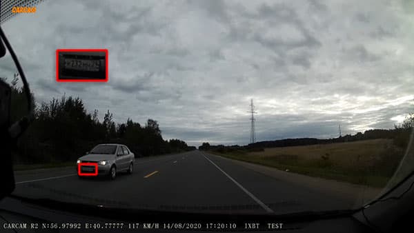 Но и здесь, как видим, номера встречного авто остаются различимыми. Это означает, что камера регистратора, несмотря на низкий уровень освещенности, продолжает вести съемку с достаточно высокой частотой кадров, благодаря чему зафиксированные объекты остаются резкими, не смазанными.