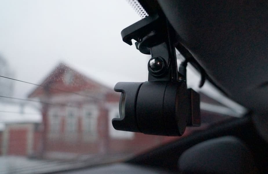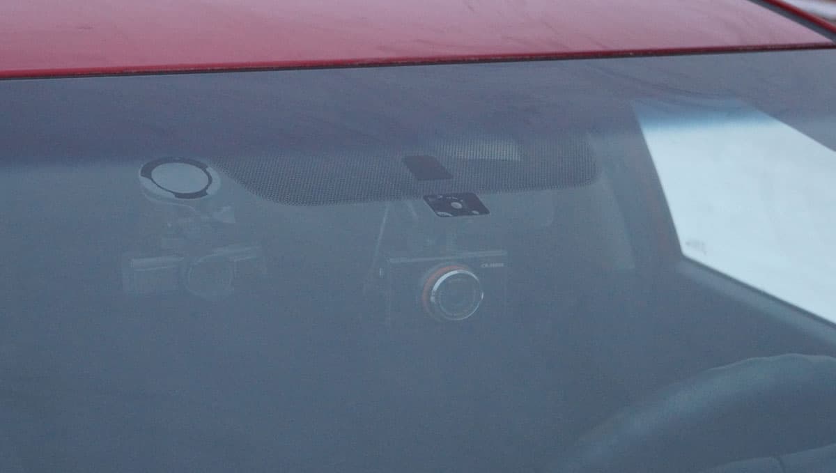 Установленный на лобовом стекле основной регистратор мало заметен снаружи благодаря отсутствию ярких выделяющихся деталей на его лицевой стороне. Это видно по следующему фотоснимку. Для контраста рядом с нашим регистратором находится другой регистратор, с дизайном, который бьет по глазам.