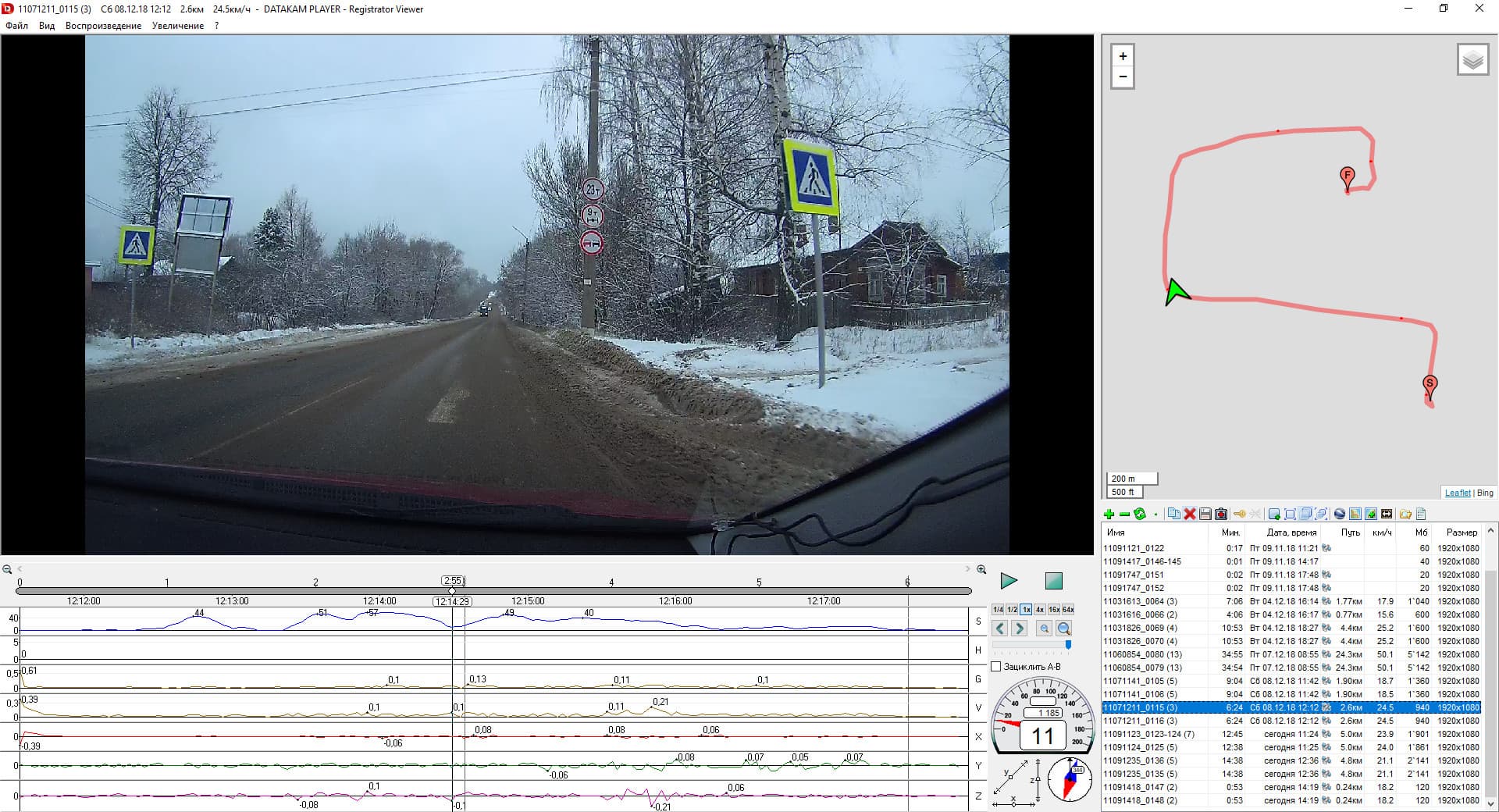 Программное обеспечение, с помощью которого на компьютере производится просмотр записанных роликов, называется Datakam Viewer. Эта программа отображает огромное количество информации своим видом и функциональностью оно напоминает известную программу Registrator Viewer. Здесь во время просмотра видео отображаются логи ускорений и скоростей, а также отрисовывается маршрут, пройденный с момента включения регистратора до его выключения.