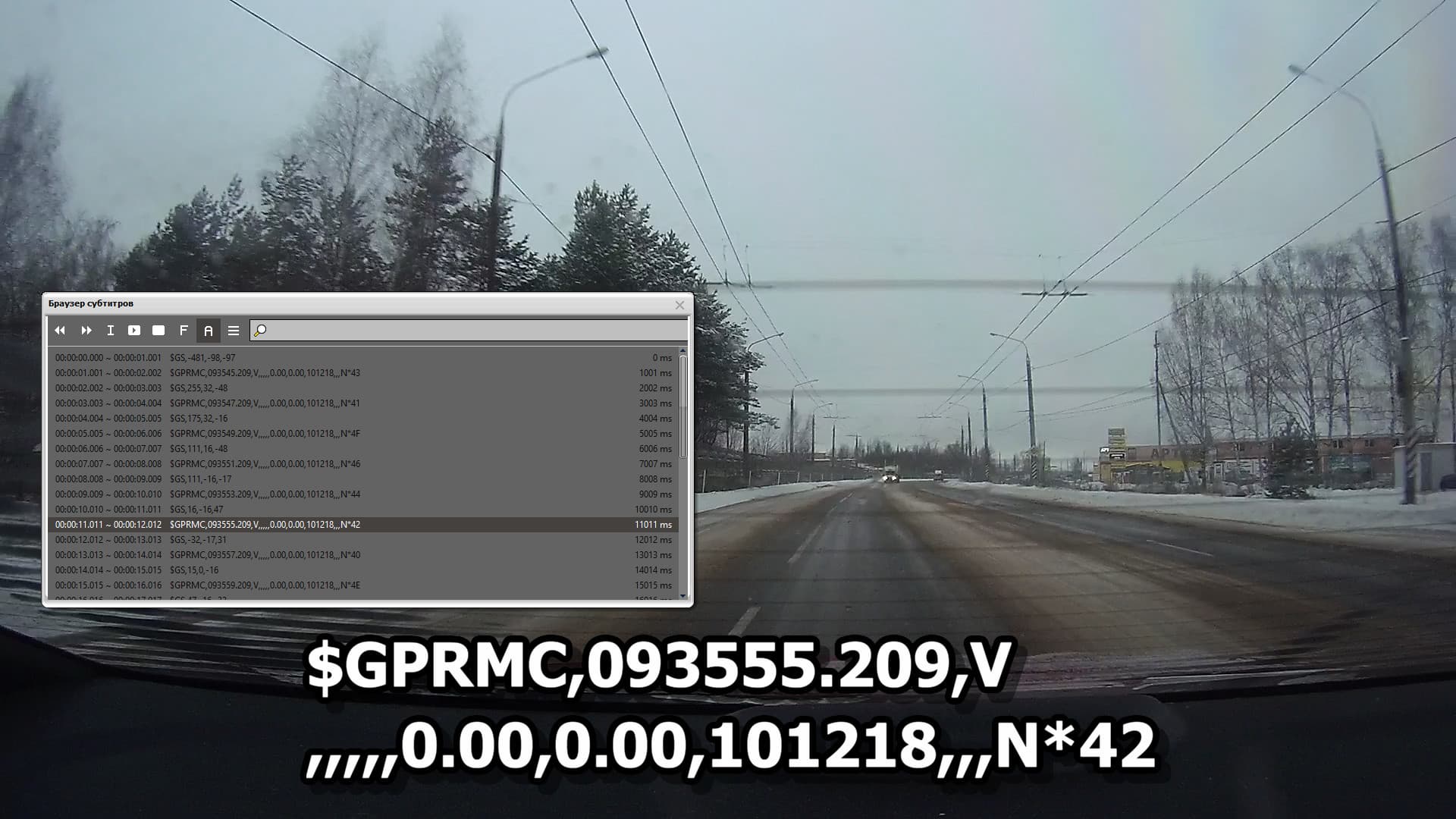 Эти субтитры отображаются поверх видео в программных плеерах при воспроизведении на компьютере. По всей видимости, в этих субтитрах записана GPS-информация по протоколу NMEA 0183.