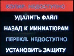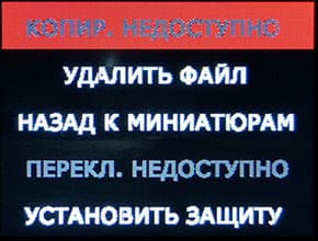 Во втором меню, называемом Просмотр, производится сортировка и воспроизведение записанных на карту памяти видеороликов. Здесь же доступно их удаление, активация защиты от стирания, а также копирование на вторую карту памяти.
