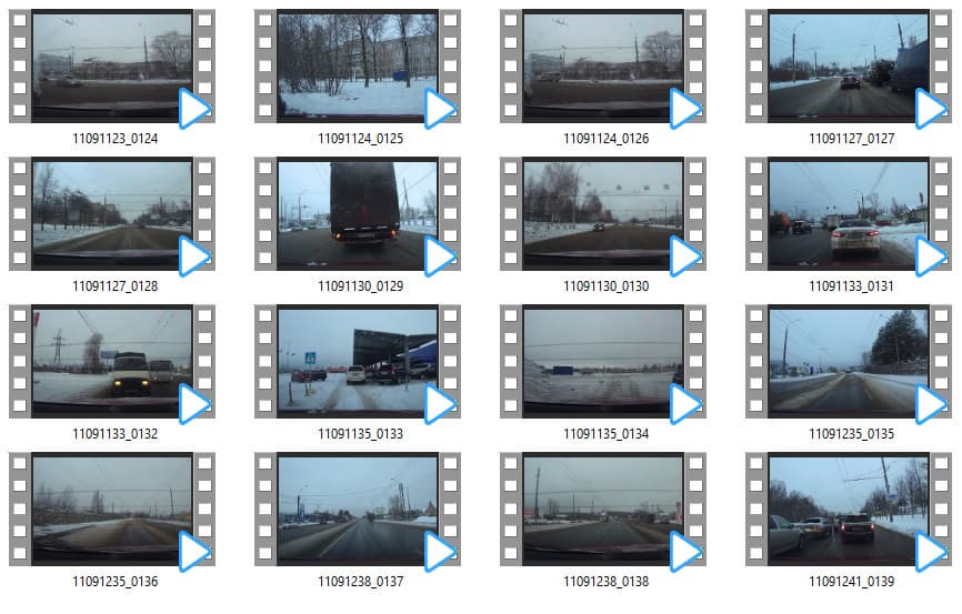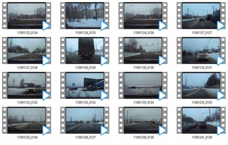 При переводе регистратора в режим плеера на дисплее и на внешнем HDMI выходе отображаются миниатюры записанных файлов. Здесь, в файловом модуле, разрешается осуществлять навигацию по архиву, просмотр и копирование выбранных файлов с одной карты на другую.