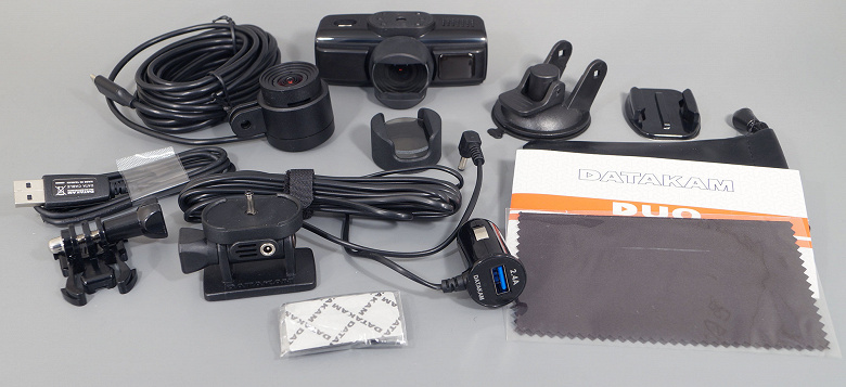 Ввиду удваивания количества гаджетов, которые требуется прикреплять к стеклам автомобиля, увеличилась и комплектность: для второй выносной камеры добавлено свое крепление. Чтобы не мудрить, разработчики поступили правильно. Они воспользовались уже существующим и широко распространенным типом крепления, какое используется для фиксации экшн-камер. Таким образом, пользователь, потеряв или испортив это крепление, сумеет приобрести его копию в любом магазине электроники. В том числе и в интернет-магазине.
