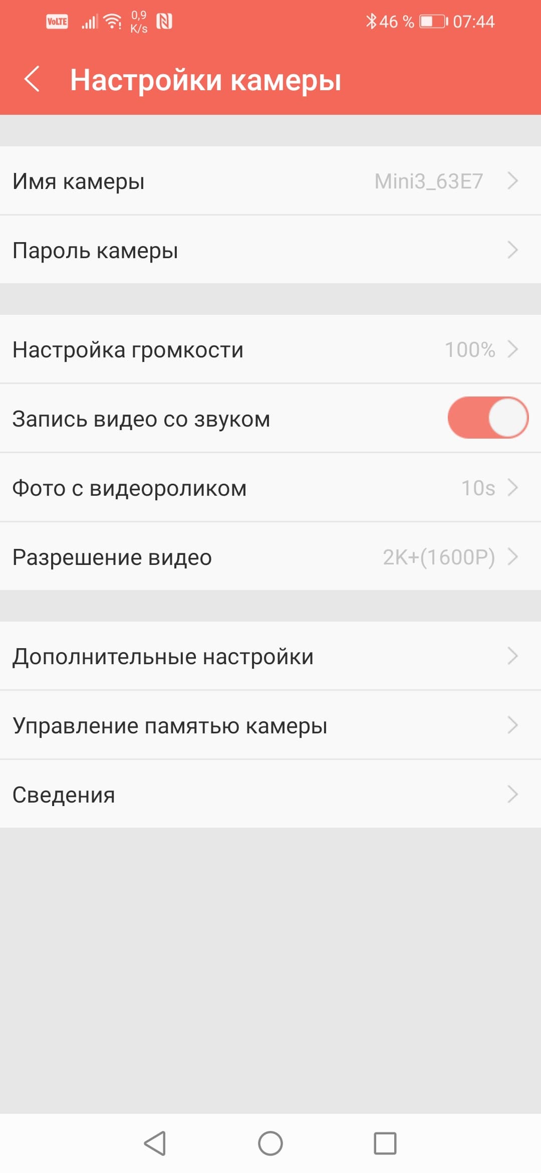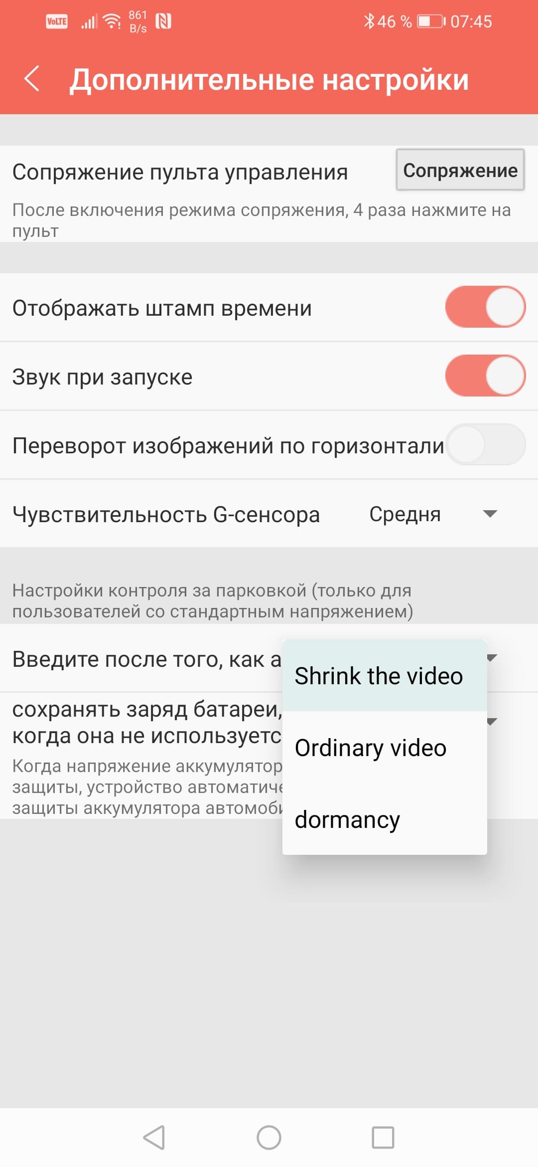 Настройки приложения и регистратора собраны во вкладке Профиль. Здесь можно выбрать разрешение видео, изменить пароль Wi-Fi-точки камеры и чувствительность G-сенсора, перевернуть изображение по горизонтали, отключить звуковые оповещения. Нужно отметить недостаточно аккуратную локализацию текстовых элементов: зачастую невозможно понять назначение того или иного пункта.