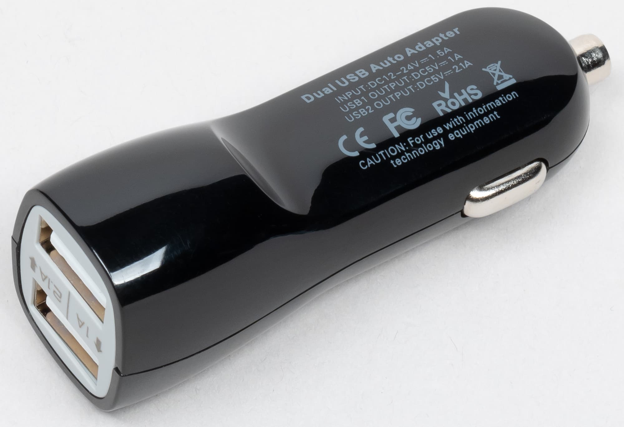 Прилагаемый адаптер прикуривателя может работать от бортовых систем легковых и грузовых автомобилей, выдавая 5 В с силой тока до 2,1 А. Наш регистратор можно подключить к любому из двух USB-портов адаптера. Это означает, что его потребление не превышает 5 Вт.