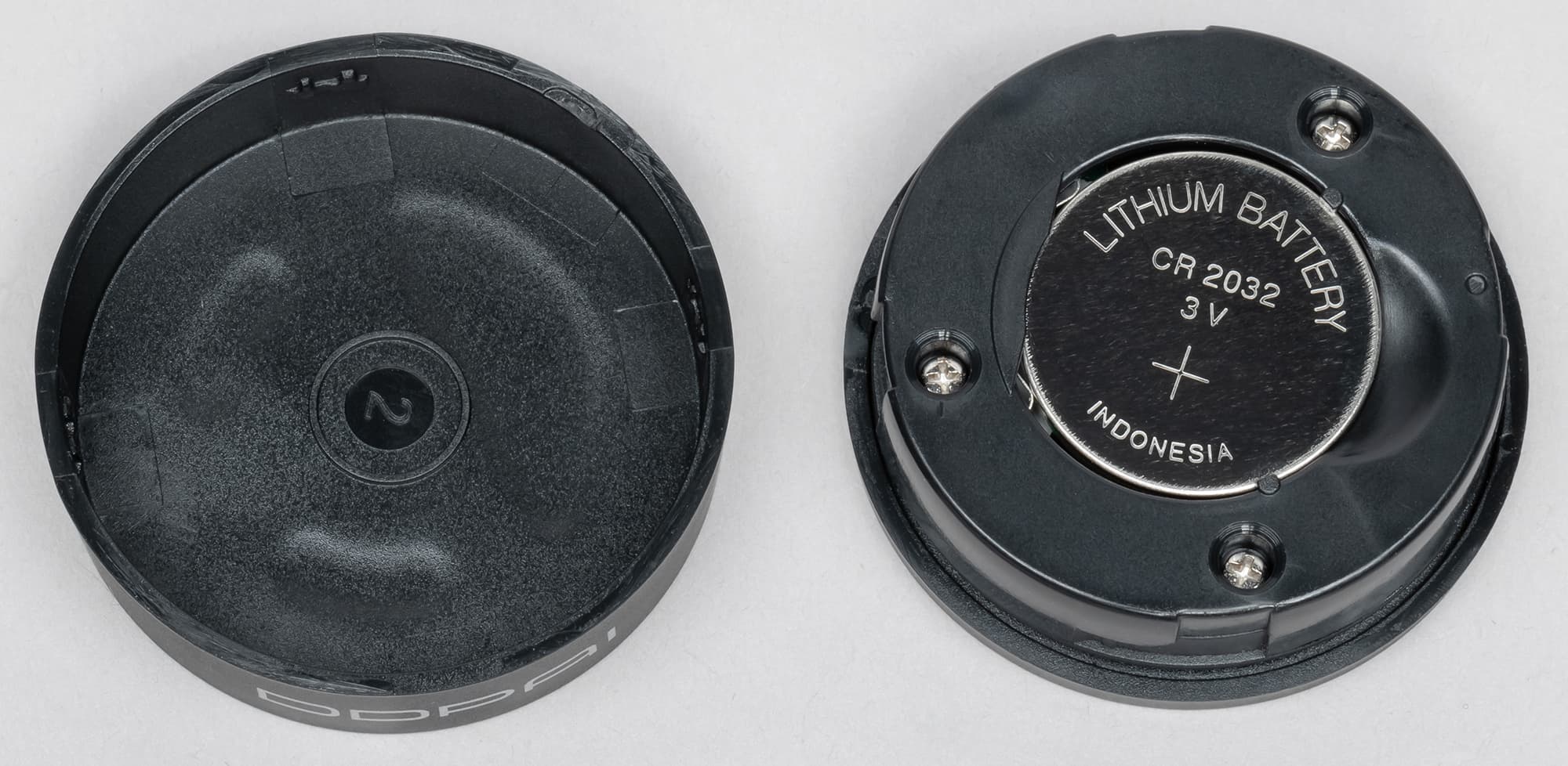 Внешняя кнопка легко разбирается. Эта простая разборка показывает, что приборчик питается от распространенной трехвольтовой литиевой батарейки CR 2032 (если кто не знает, то цифры расшифровываются так: 20 — это диаметр в миллиметрах, а 32 — это толщина в десятых долях миллиметра, то есть 3,2 мм).