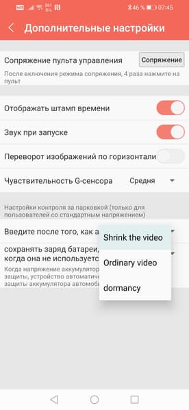 После нескольких смен настроек, включений-выключений регистратора и длительных ожиданий мы выяснили, как работает этот самый режим парковки. Регистратор, получая питание, ведет запись. Но если в течение некоторого времени (около 20 минут) G-сенсор не получает никаких данных о движении, тряске и перемещениях, аппарат под короткое мелодичное треньканье переходит в тот самый режим ожидания. При этом светодиодный индикатор меняет цвет с оранжевого на синий. Соответственно, никакая запись в режиме не ведется. Однако Wi-Fi-точка продолжает работать. Но стоит запустить на смартфоне трансляцию видео или тихонько коснуться регистратора, как он включает запись, о чем свидетельствует светодиод, вновь загорающийся оранжевым.
