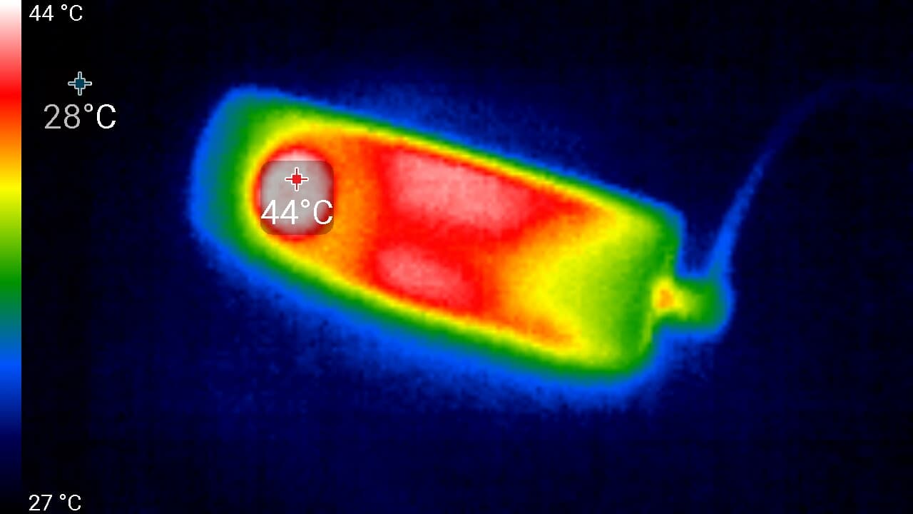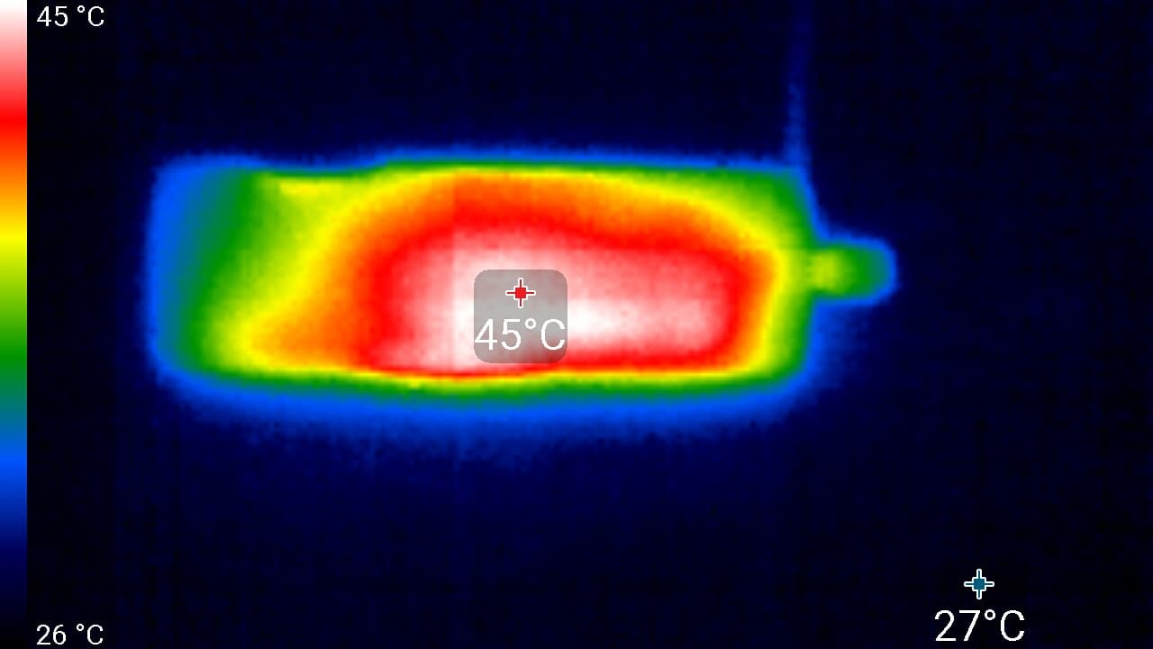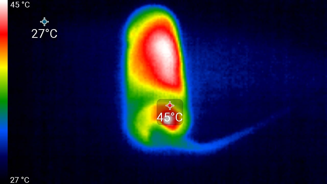Во время длительной работы корпус аппарата заметно нагревается. Ниже приведены тепловизионные снимки прибора, сделанные после часа беспрерывной видеозаписи. Тестирование проводилось в помещении при температуре окружающего воздуха около 25 °C.