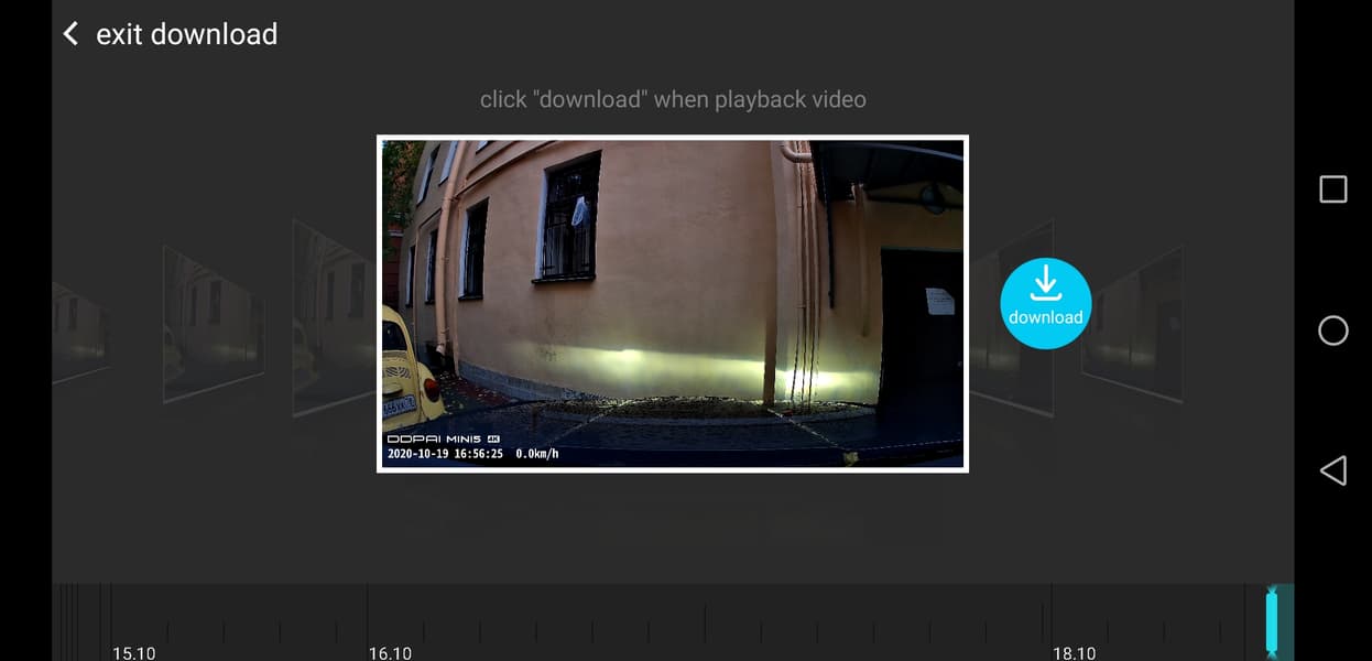 Видео представлено в виде галереи миниатюр с первым кадром каждого фрагмента. Вам нужно выбрать требуемый отрезок видео и нажать голубую кнопку загрузки, расположенную справа от миниатюры. Тогда начнется процесс загрузки видео на смартфон, а также (почему-то) одновременно просмотра этого фрагмента.