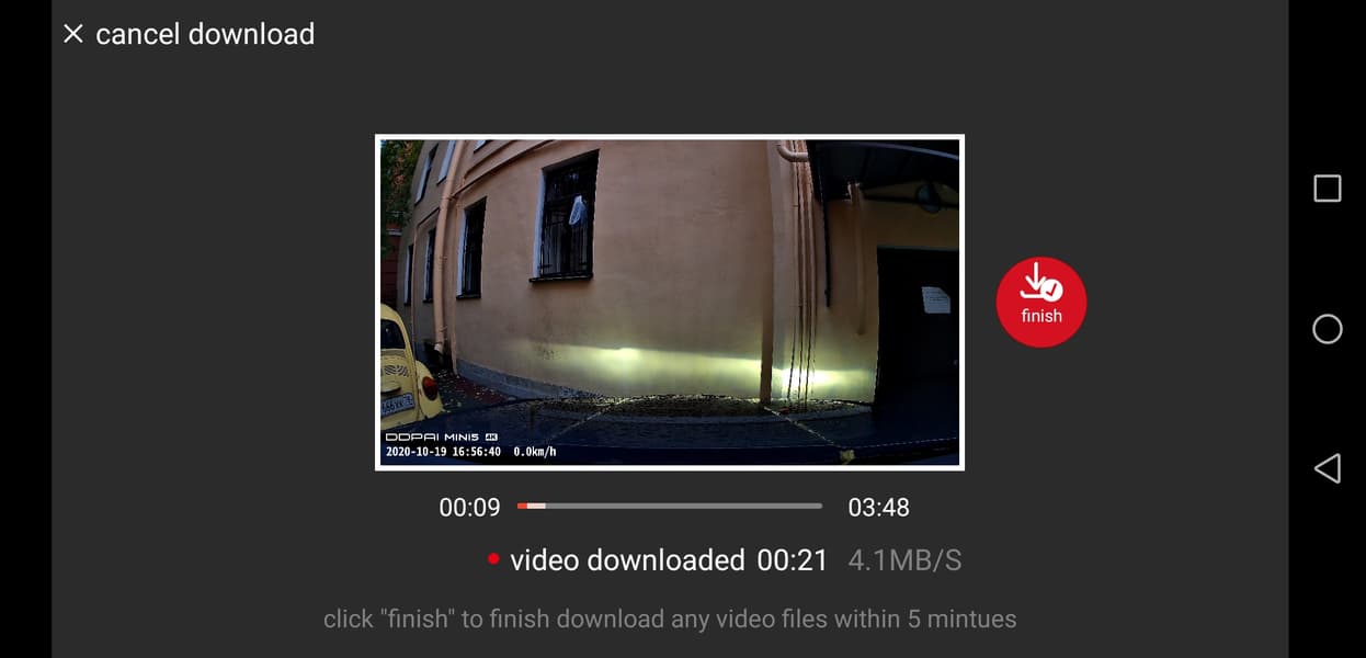 Забавно, что хотя в самом видеорегистраторе в каждом отдельном файле хранится 1 минута видео, файлы, скачанные через программу на смартфон, имеют длину 5 минут. На самом смартфоне их можно обнаружить в каталоге «Внутренняя память\ddpai_overseas\video», а фотографии, соответственно, будут в папке «Внутренняя память\ddpai_overseas\image».