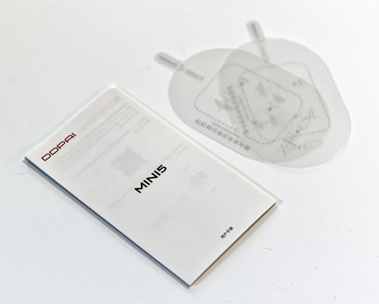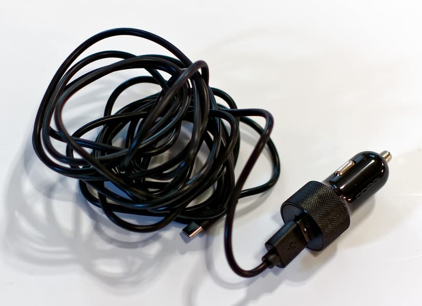 В коробке мы обнаружили собственно видеорегистратор, кронштейн с уже установленным на него двухсторонним скотчем 3М, адаптер питания для прикуривателя с одним гнездом USB, кабель с разъемами USB Type A и Type C, инструкцию на китайском и две прозрачные пластиковые пластинки, назначение которых так и осталось для нас загадкой.