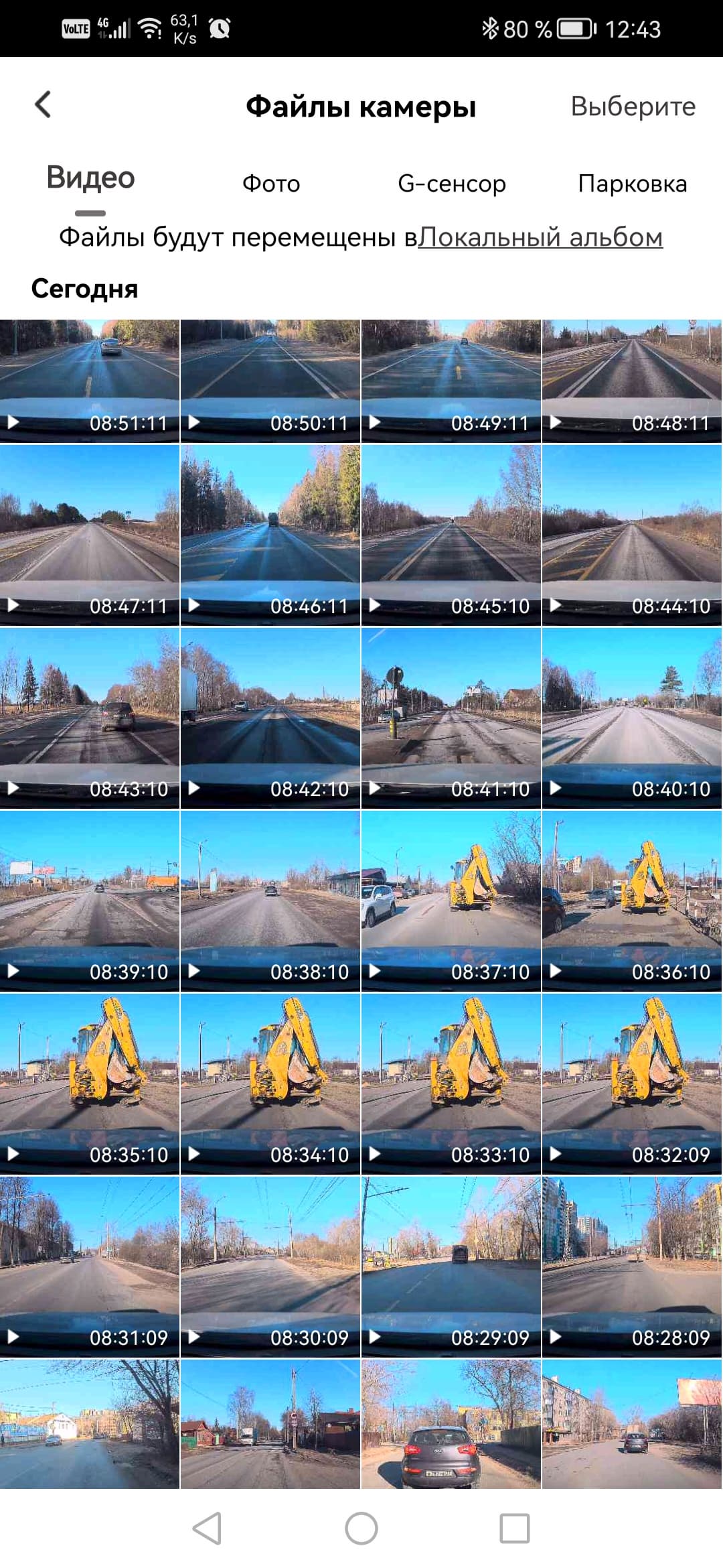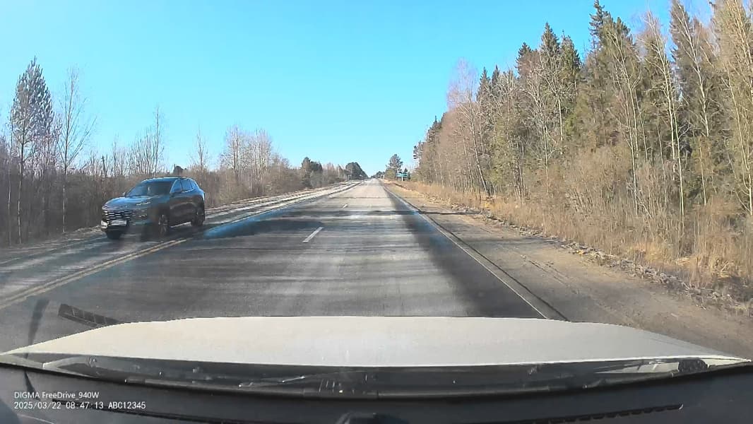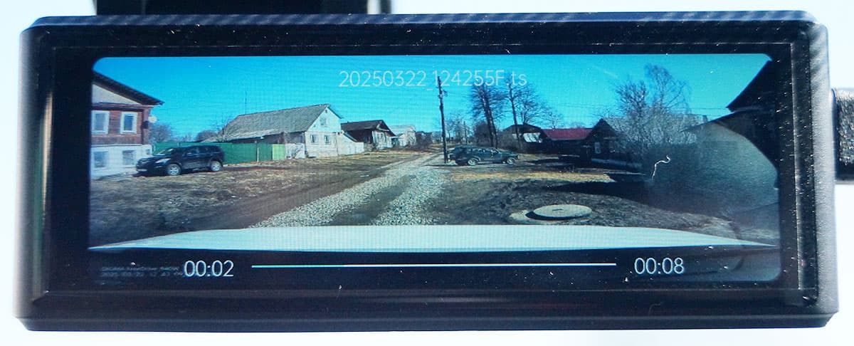 Во время записи регистратор разбивает материал на отрезки заданной длительности, в нашем случае это 1-, 2- или 3-минутные отрезки. Материал сохраняется на карту памяти в папку с именем Driving. При срабатывании G-сенсора ролик будет записан в папку Event. Имена файлам регистратор присваивает по следующей схеме: 20250322_123111F.ts, где первый блок содержит текущую дату, второй блок — время, а буква F означает Front — фронтальная камера.