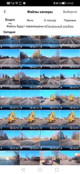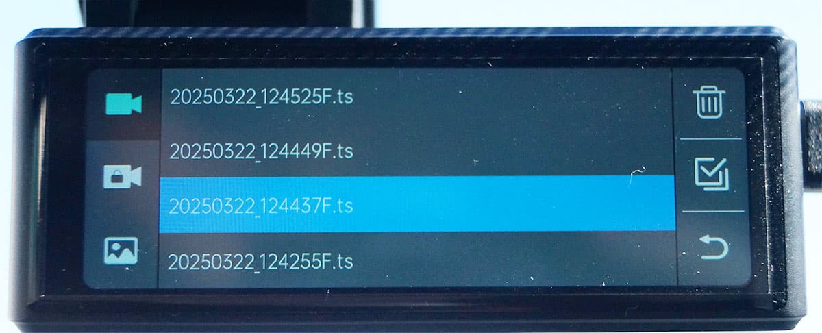 Просмотр записей, сделанных регистратором, возможен непосредственно на дисплее, для этого во встроенном ПО имеется файловый браузер, отображающий имена записанных видеофайлов.