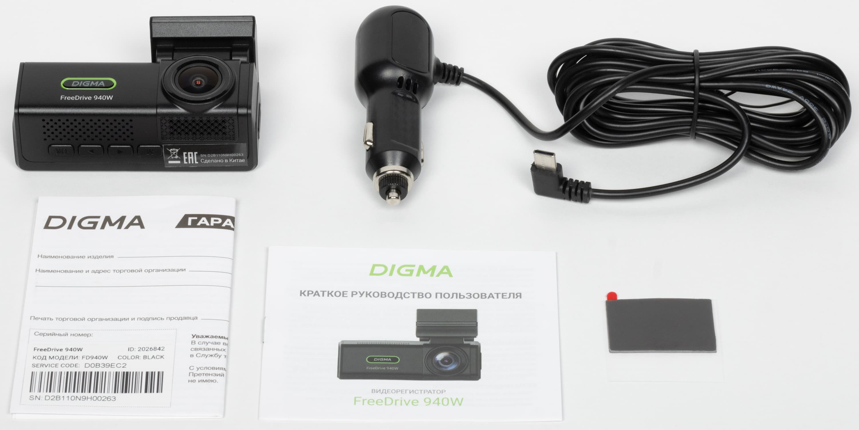 В комплекте к регистратору прилагаются адаптер прикуривателя с кабелем длиной 3,4 метра, кусочек двусторонней клейкой ленты и руководство пользователя с гарантийным талоном.