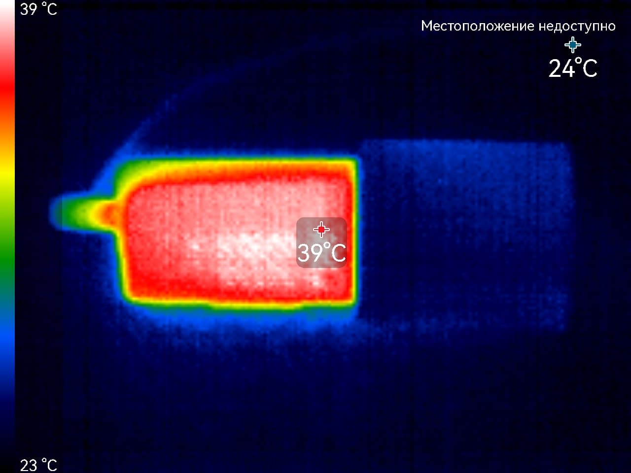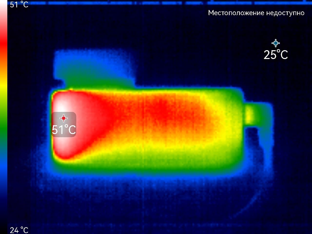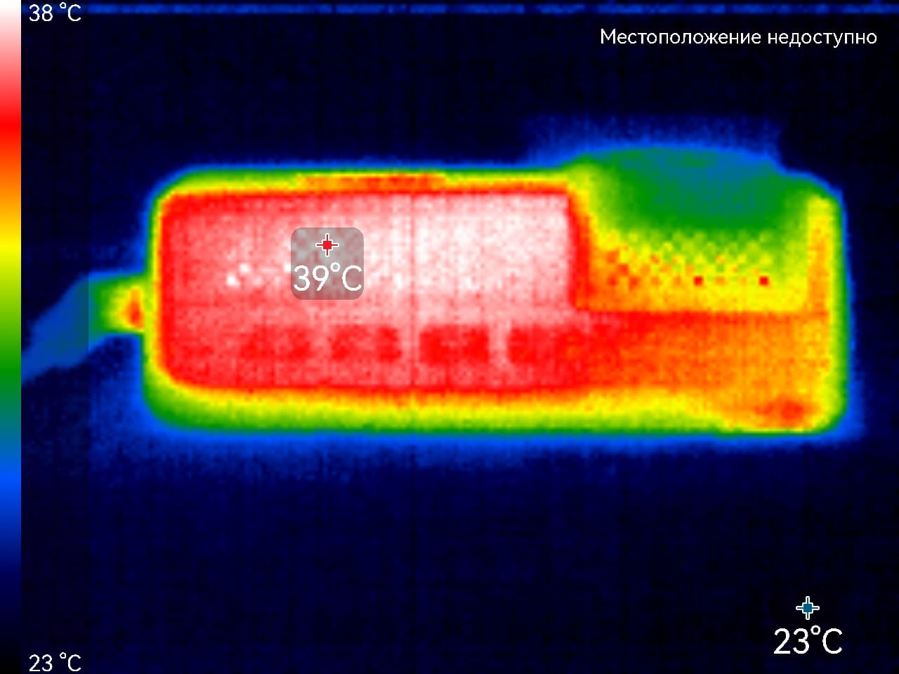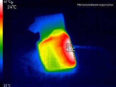 Во время длительной работы корпус аппарата нагревается незначительно. Далее приводятся тепловизионные снимки регистратора, сделанные после часа беспрерывной видеозаписи с работающим дисплеем. Питание регистратору подавалось стационарное 12 В, тестирование проводилось в комнатных условиях при температуре окружающего воздуха около 24 °C.