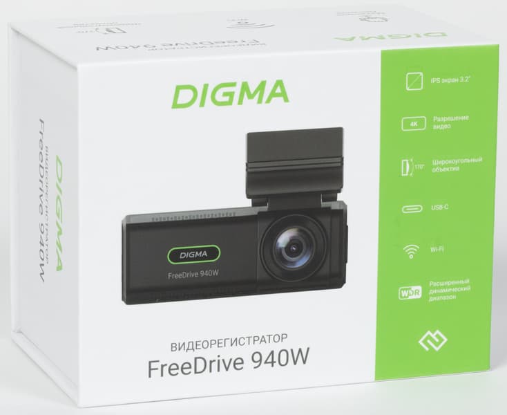 Регистратор Digma FreeDrive 940W поставляется в коробке с напечатанными на ней основными техническими характеристиками прибора.