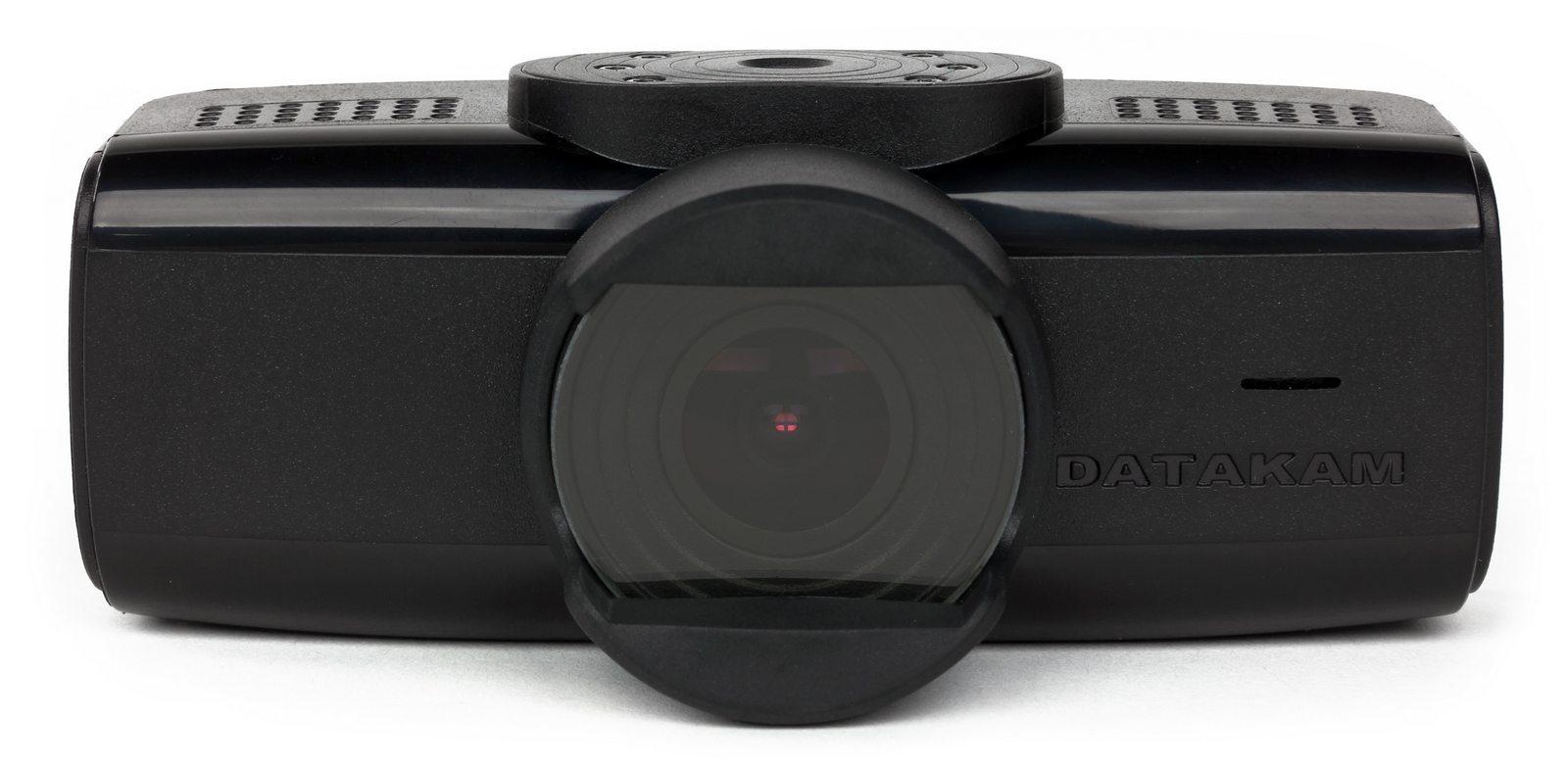 Передняя часть Datakam G5-City Pro-BF, на которой расположен объектив камеры, оборудована небольшим отверстием, за которым находится микрофон, а динамик предположительно находится под одним из вентиляционных отверстий на верхнем торце видеорегистратора.