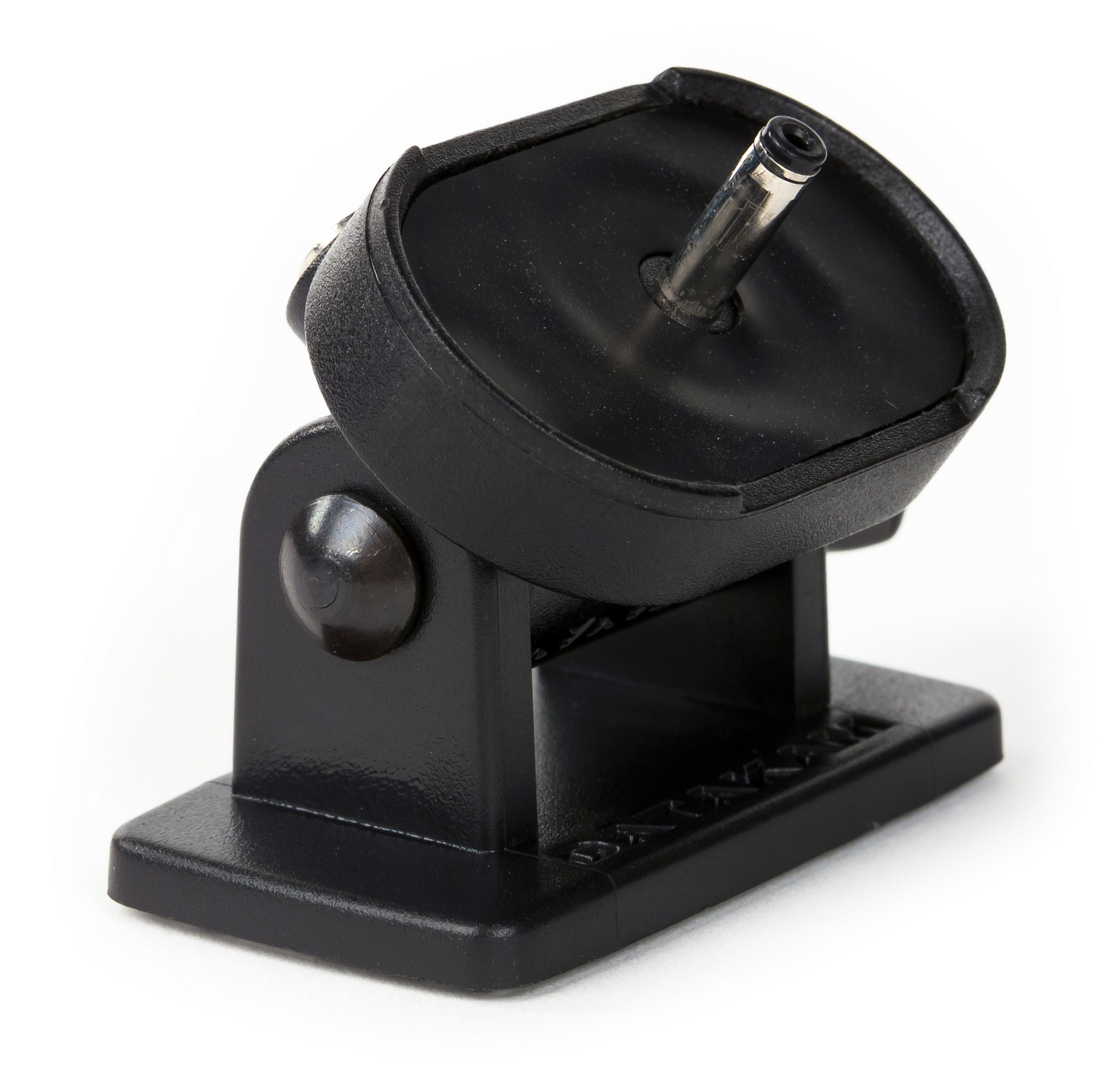 Кронштейн имеет сильно выступающий штырь с металлическим основанием и небольшой разъем для подключения питания. Поскольку на самом видеорегистраторе верхняя панель оборудована мощным неодимовым магнитом, если поднести кронштейн к устройству и «наживить» его, он сам притянется к магниту и надежно закрепится внутри небольшой овальной площадки. Площадка, за счет специального пластикового бортика, позволяет закрепить Видеорегистратор в четырех положениях — в салон, в сторону лобового стекла, в сторону водителя и в сторону переднего пассажира (с шагом в 90°). Самый главный плюс этого крепления конечно в том, что при повороте в любую сторону питание не пропадает. Более того, это позволяет единожды проложить кабель по салону автомобиля, так как сам кабель крепится к площадке, статично закрепленной на лобовом стекле.