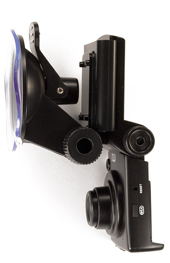 В данном конкретном случае присоска снабжена пластиной с салазками, в которую «вставляется» регистратор. После четырех-пяти манипуляций движение «отжать защелку — вынуть — сопоставить пазы — вставить» отрабатывается до автоматизма, в результате чего присоска обосновывается на лобовом стекле, а устройство снимается и устанавливается в течение 2-3 секунд. Степень свободы у крепления только одна: она позволяет заставить объектив смотреть «выше» или «ниже».