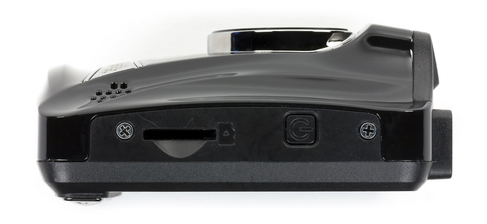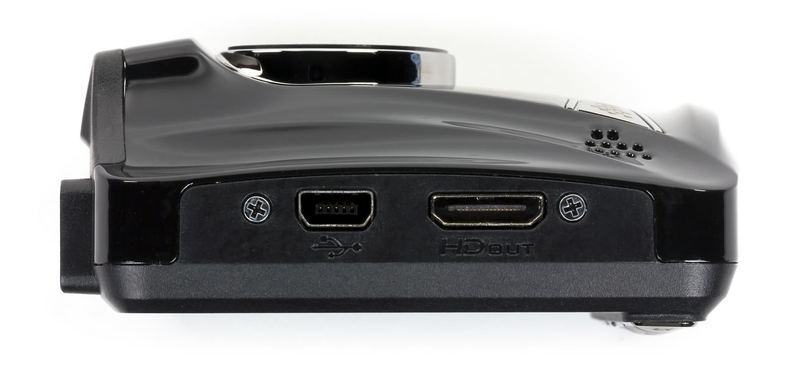 Автомобильный видеорегистратор HP Car Camcorder f310 имеет стандартный разъем для подключения питания — Mini-USB, который также используется и для подключения к ПК. Под этим разъемом на правой боковой грани модели расположен видеовыход Mini-HDMI (Type C). На противоположной грани находится утопленная кнопка включения и слот для карты памяти microSD.