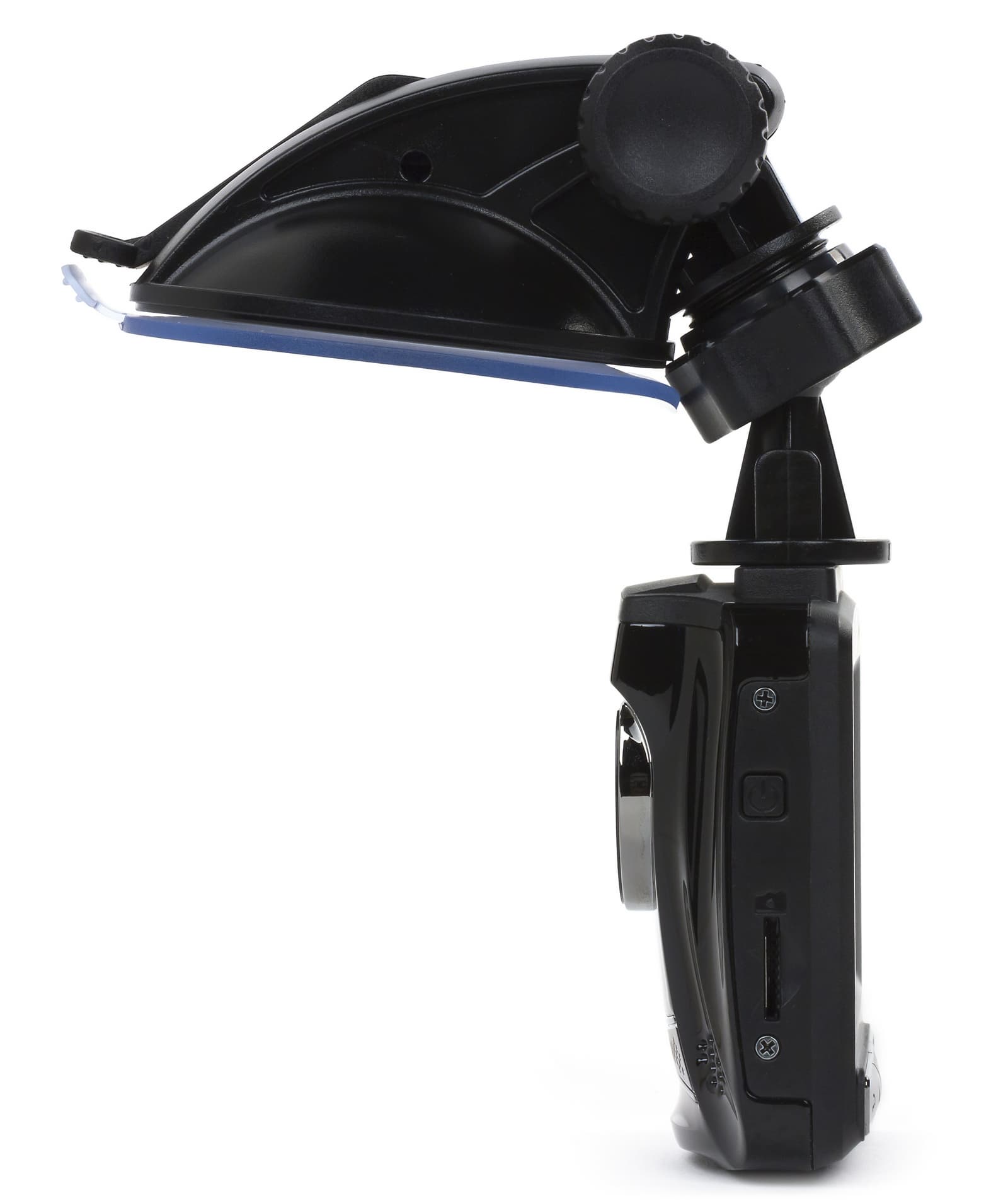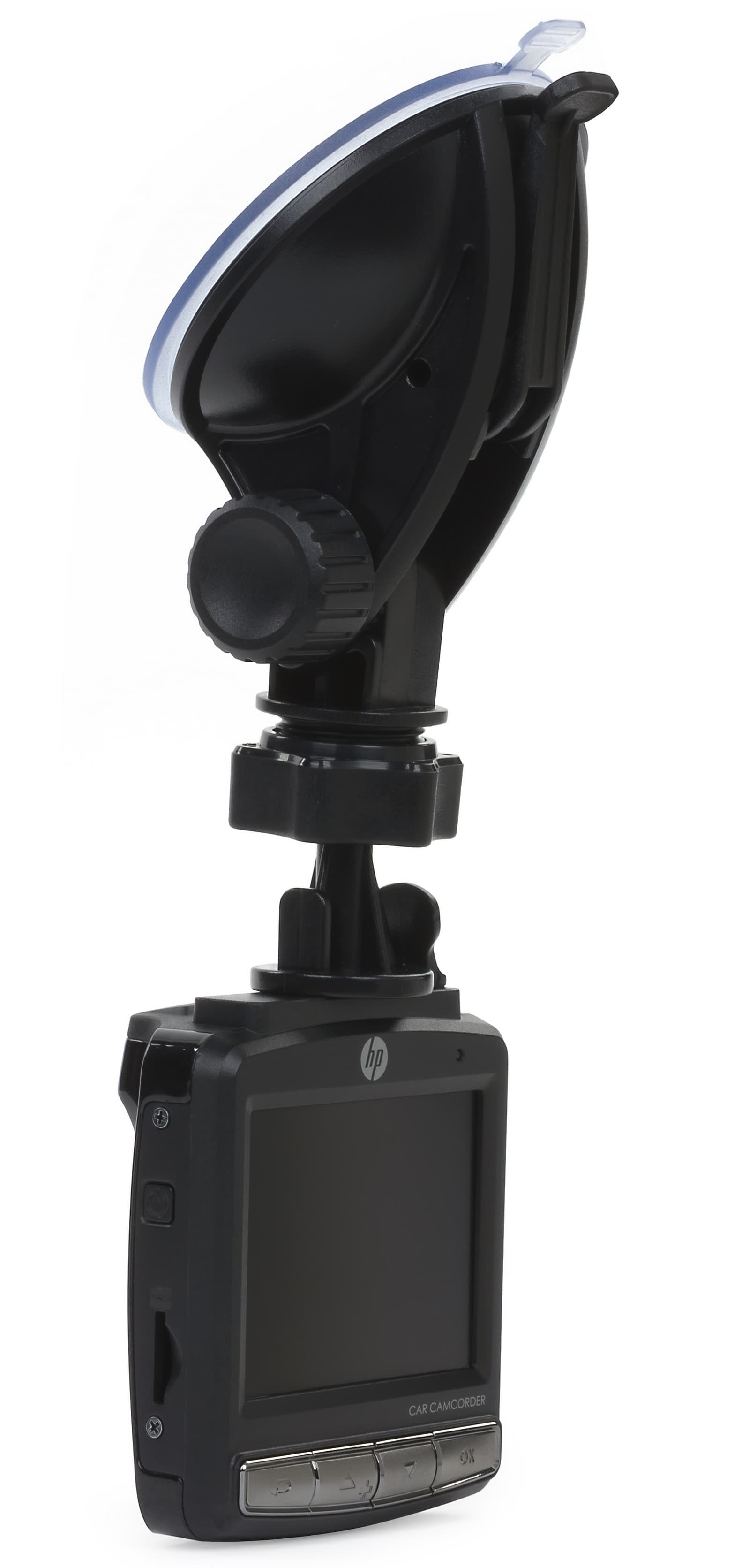 Итак, поговорим о системе крепления. В комплекте с HP Car Camcorder f310 поставляется полностью собранный кронштейн с присоской. Присоска зажимается отдельной штангой, а ее размер сопоставим с размером самого видеорегистратора. Отметим, что габаритные размеры модели составляют 63×70×29 мм, а вес — 89 г. Сам кронштейн позволяет вращать видеорегистратор на 360° в горизонтальной плоскости за счет шарового шарнира на креплении защелки, к которой крепится сам видеорегистратор.
