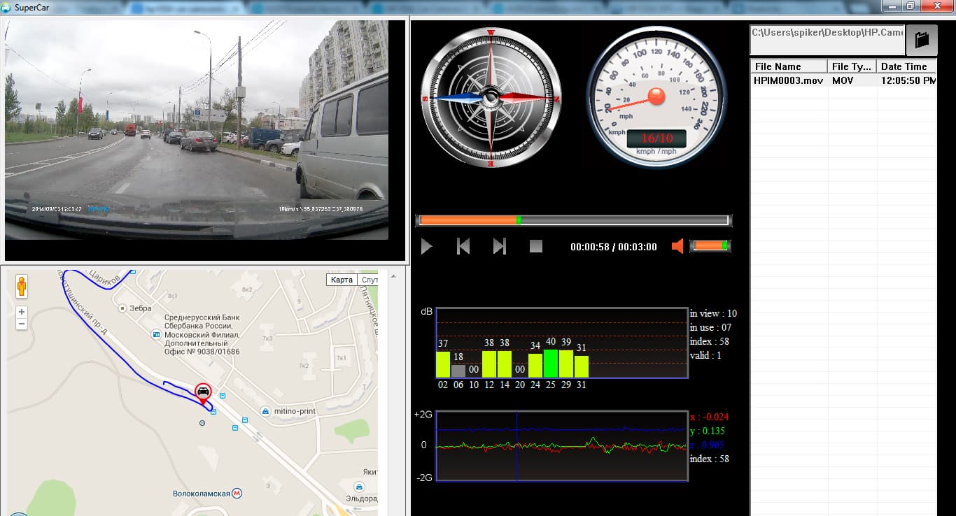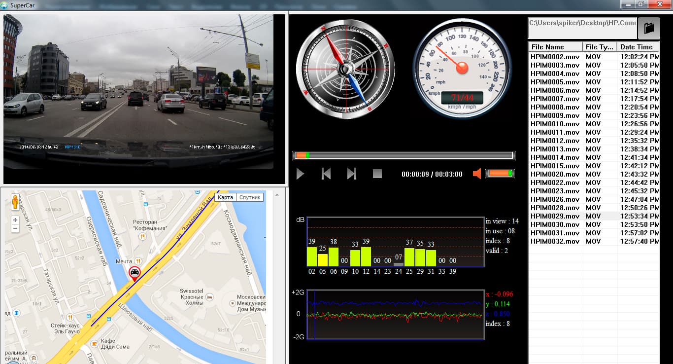 Справа в основном окне SuperCar находится список выбранных видео, при клике на любом из них начнется воспроизведение. Каждый из представленных видеороликов содержит в себе 3- или 5-минутную (в зависимости от настройки) запись с камеры видеорегистратора. Активный GPS-модуль значительно расширяет возможности обычного просмотрщика видео — записанные видеоролики получают точную дату и время, скорость движения автомобиля, пройденный путь и текущие координаты. Кроме того, в отдельном окне отображается пройденный путь и местоположение автомобиля на основе карт Google Maps. Также при воспроизведении SuperCar строит посекундный график датчика удара и показывает качество приема сигнала со спутников GPS.