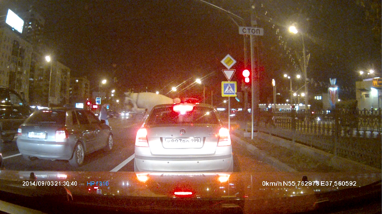 Посольку видеорегистратор HP Car Camcorder f310 поддерживает технологию WDR — Wide Dynamic Range, мы протестировали его в двух режимах — с отключенной функцией WDR и с включенной. Эта технология применяется для того, чтобы улучшить качество картинки в темное время суток, без использования вспомогательной подсветки. В остальном ночная съемка осуществлялась с теми же параметрами, что и дневная.