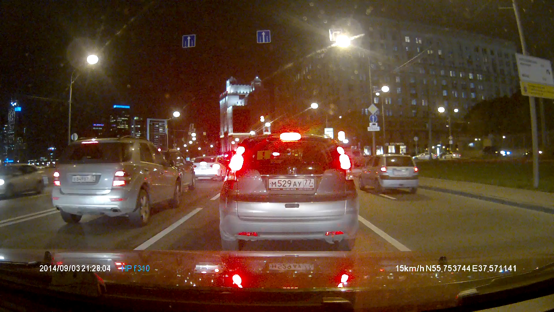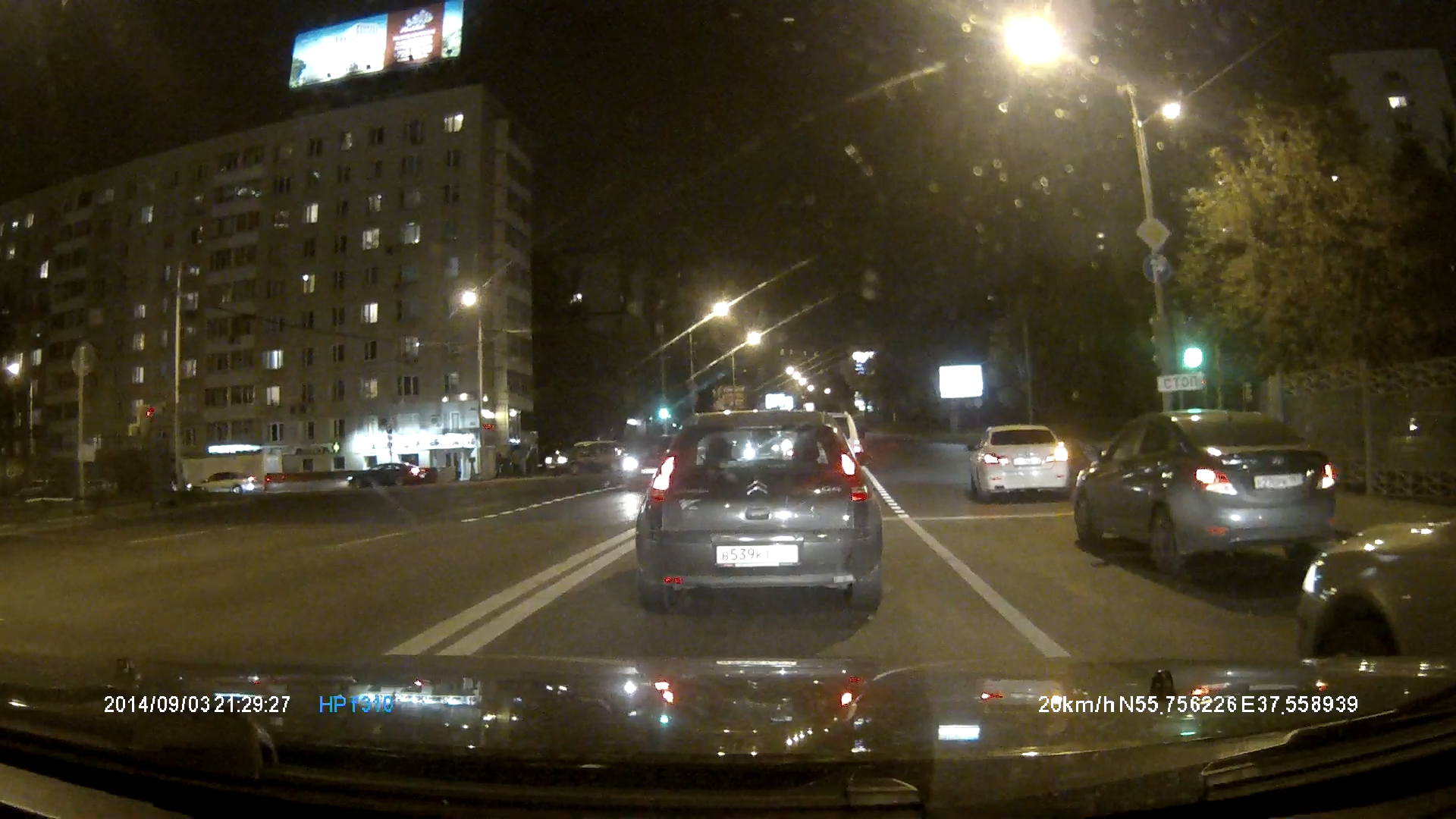 В режиме съемки с разрешением 1920×1080 видеорегистратор HP Car Camcorder f310 показывает весьма неплохие результаты. Номера близлежащих автомобилей в большинстве своем различимы, указатели и информационные знаки также хорошо читаемы. Увы, при больших разницах в скорости у попутно идущих автомобилей, номерные знаки уже различимы с большим трудом.