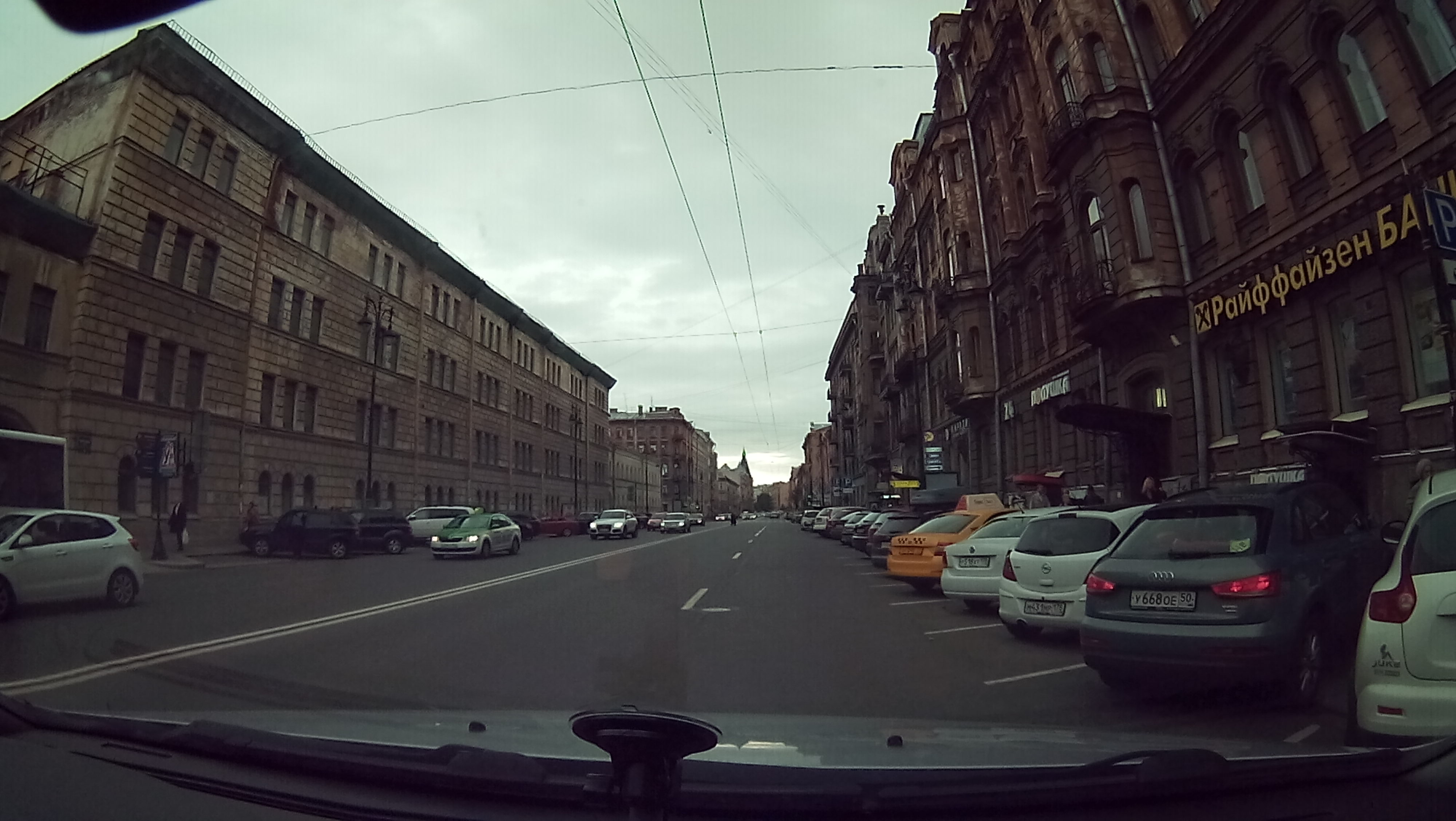 Дневное видео довольно средненькое. Не плохое, нет — именно «средненькое». Геометрические искажения не ужасающие, но все же хорошо заметные, все какое-то монотонно-блеклое, оттенки серого питерского неба переданы в сильно оскудненном виде :) И главное — постоянно не хватает четкости. Чтобы увидеть номер автомобиля, нужно подъехать на расстояние метра 3-4, иначе все сливается в неразличимые закорючки черного цвета. При этом битрейт не так уж и мал — 12,6 мегабит в секунду.
