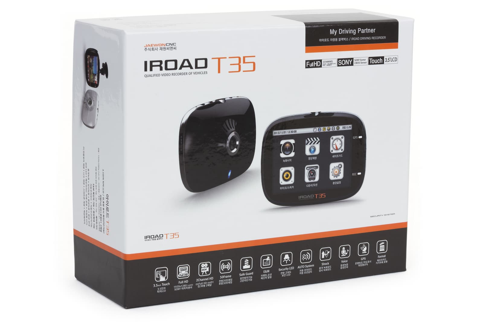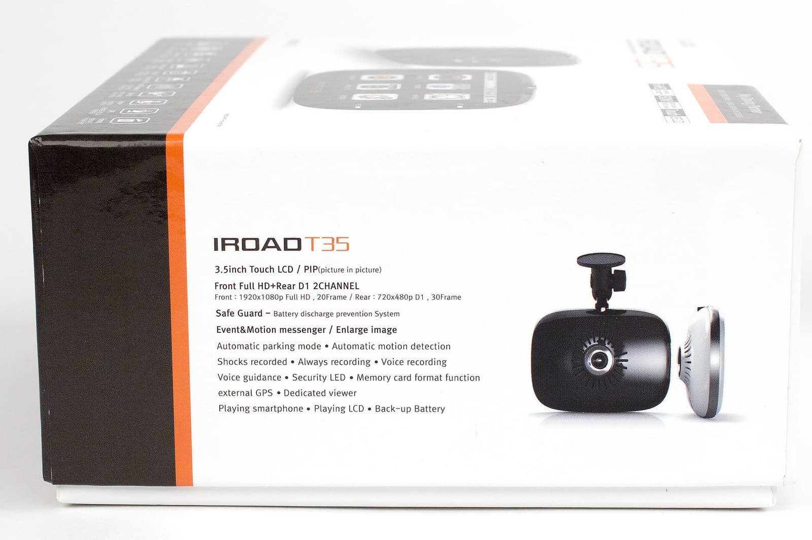 Модель Iroad T35 выделяется на фоне других видеорегистраторов компании, поскольку является продолжением сразу двух моделей — Iroad T7 и Iroad Ipro35 и, по сути, представляет собой одно из топовых решений в линейке. Устройство обладает контрастным сенсорным экраном 3,5″, поддерживает запись в двухканальном режиме, имеет датчик движения, датчик удара, встроенный аккумулятор и функцию паркинга, которая позволяет записывать видео при обнаружении движения перед объективом. Основная камера видеорегистратора позволяет снимать видео с разрешением Full HD 1920×1080 со скоростью 20 кадров/с, а дополнительная камера записывает видео с разрешением 720×480 при 30 кадрах/с. Видеорегистратор Iroad T35 также поддерживает подключение внешнего GPS-модуля, защиту от перегрева и вывод изображения на внешний экран.